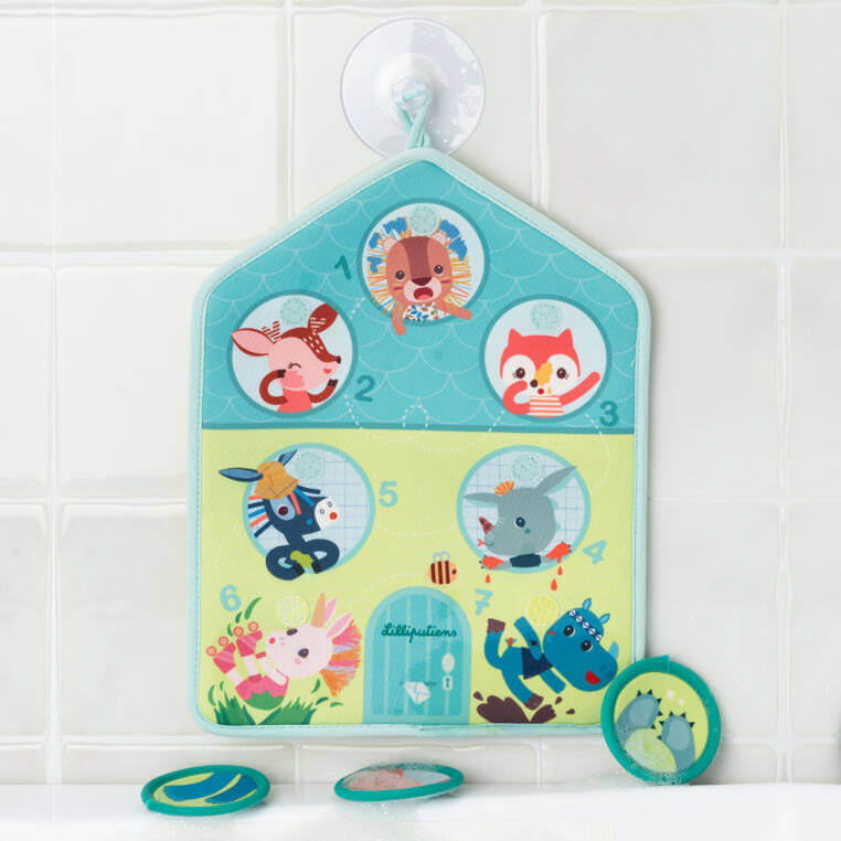 Wykonana z miękkiego, łatwego do czyszczenia i szybkoschnącego materiału. W skład zestawu wchodzi tablica w kształcie domku z solidną przyssawką oraz 7 okrągłych żetonów-obrazków, które można na niej mocować na rzep. Obrazki na żetonach przedstawiają lśniące czystością części ciała różnych zwierzątek, które należy odpowiednio dopasować do ich zdjęć ich właścicieli, znajdujących się na tablicy. Dodatkowo do każdej ilustracji na domku przyporządkowana jest cyfra, dzięki czemu dziecko podczas zabawy może ćwiczyć naukę liczenia do 7. Wszystkie elementy unoszą się na wodzie. Zabawka jest perfekcyjnie wykończona, z dbałością o każdy szczegół i w pełni bezpieczna dla dziecka. Rozwija sprawność motoryczną i koordynację ręka-oko.