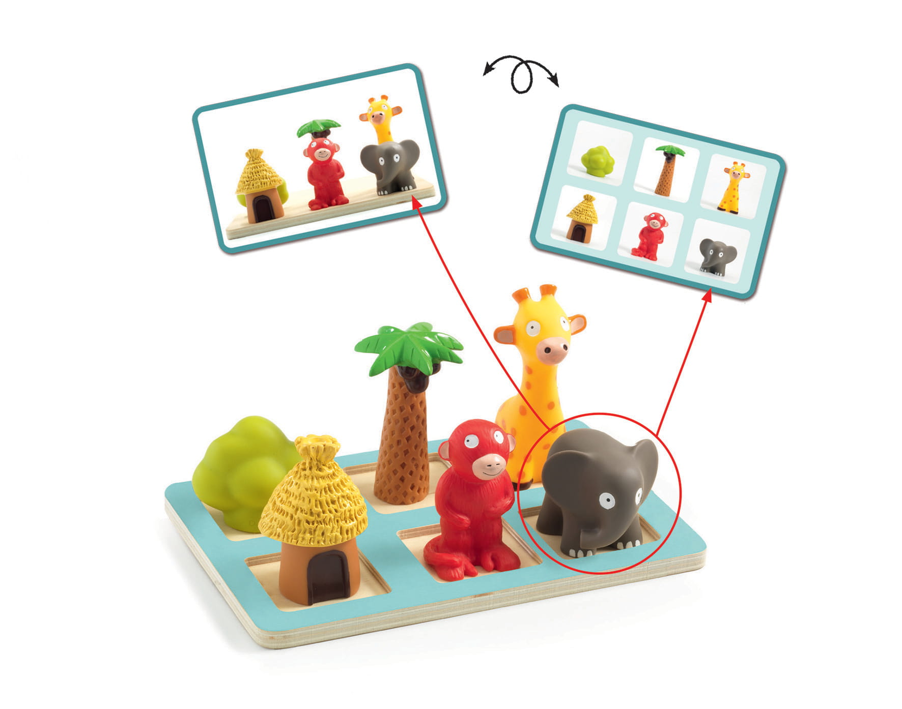 Orientacja w przestrzeni Edulo Spacio to gra zawierająca 20 kart z obrazkami i 6 figurek zwierzątek oraz 1 drewnianą planszę. Aby odtworzyć schematy przedstawione na karcie, dziecko musi prawidłowo ustawić figury na planszy: Gdzie jest żyrafa? Przed słoniem czy z tyłu? Rozwiązania przedstawione jest na odwrocie kart.