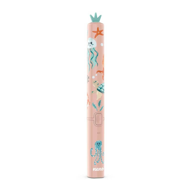 Szczoteczka wyróżnia się wesołym designem, dopasowanym do wieku dziecka. Dostępna jest w dwóch wariantach kolorystycznych – koralowym i niebieskim, a jej obudowę zdobią urocze zwierzątka morskie: żółwie, kraby, ryby, ośmiornice, a także bąbelki i wodorosty, tworząc przyjazną, podwodną scenerię. Taki wygląd sprawia, że szczotkowanie staje się nie tylko obowiązkiem, ale również ciekawą przygodą.