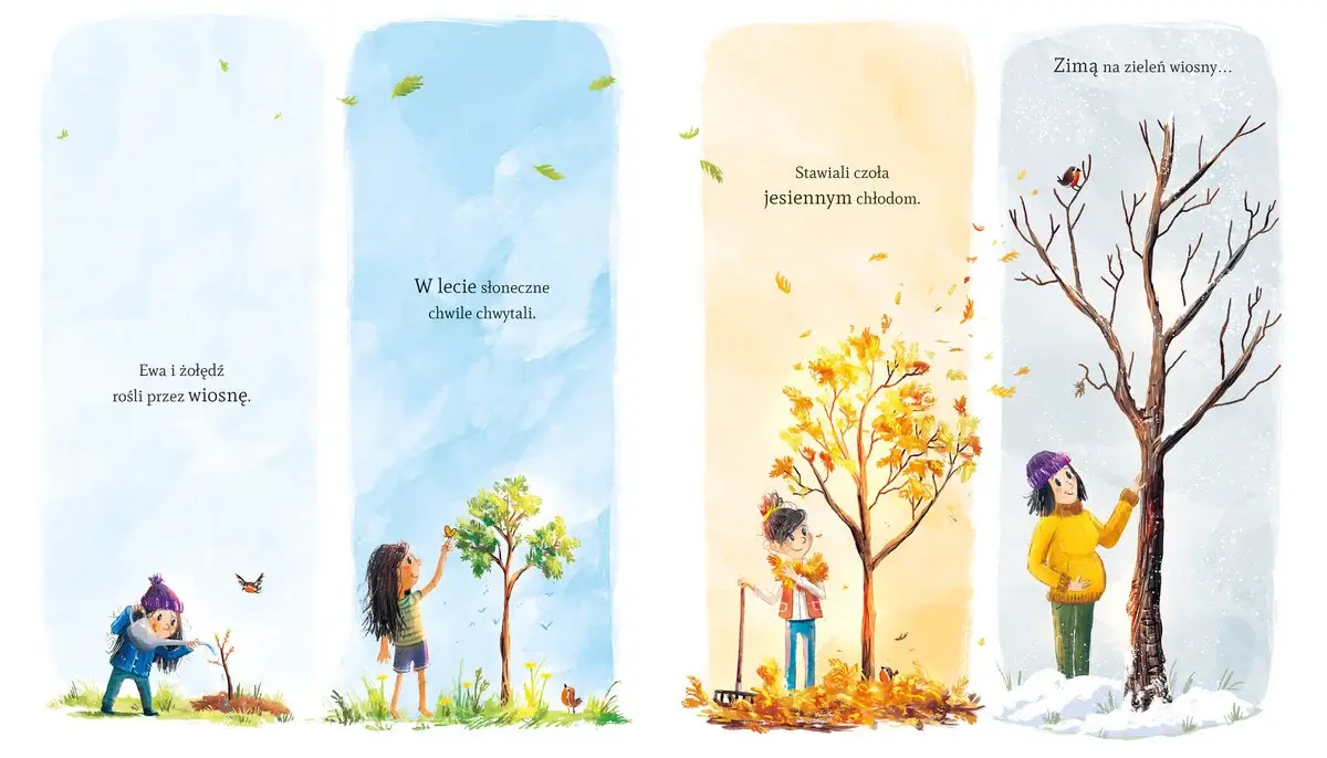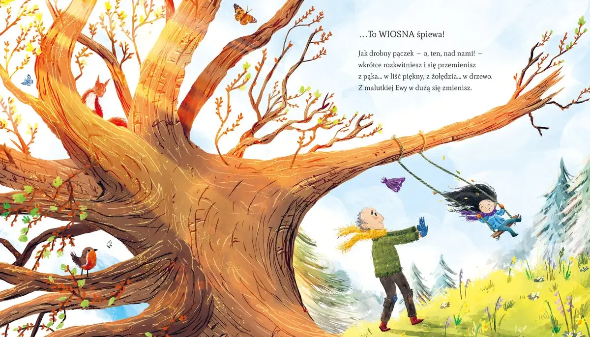 Liście spadają, pory roku się zmieniają, ale wspomnienia – te najpiękniejsze – zostają z nami na zawsze. „Ewa i dąb dziadka” to poruszająca, mądra i pełna czułości opowieść o dziewczynce, która każdego dnia z dziadkiem tworzyła wyjątkowy świat: pełen pikników, śmiechu i wspólnych chwil pod wielkim dębem. Drzewo staje się symbolem ich więzi i przemijania – bo tak jak ono zmienia się z każdą porą roku, tak też zmienia się życie dziadka.