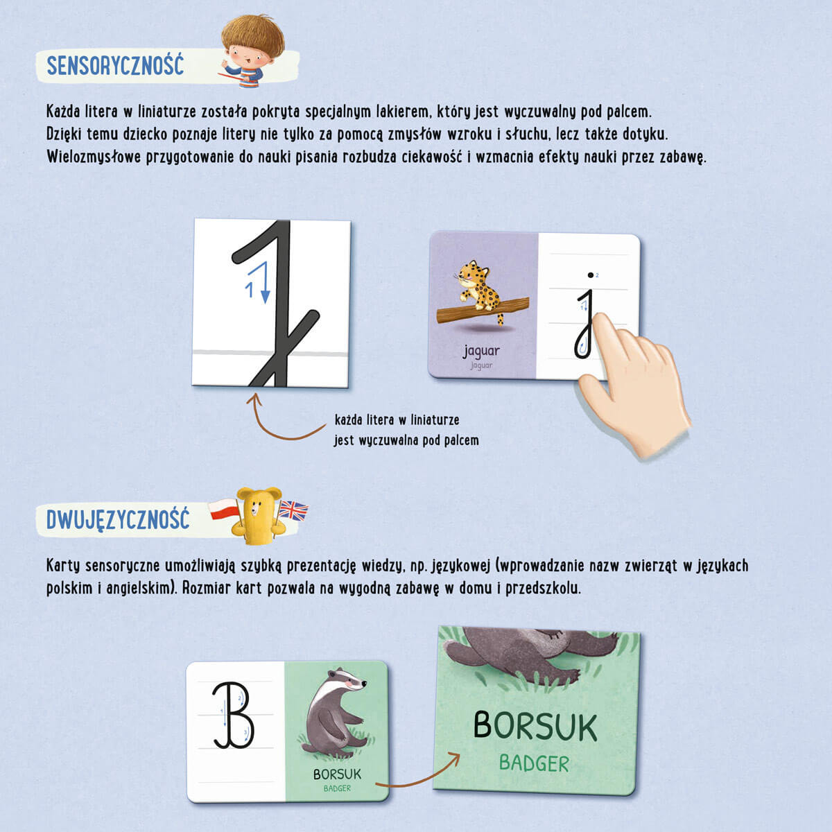 W zabawnym świecie zwierząt zilustrowanym przez Mariannę Schoett dzieci mimowolnie uczą się, jak zapisywać duże i małe litery. I to w dwóch językach (polskim i angielskim)! Przemyślany układ kart oraz technologia druku pozwalają odkrywać świat liter wielozmysłowo i doskonale się przy tym bawić. Zestaw zgodny z metodyką nauczania na szczeblach edukacji przedszkolnej i wczesnoszkolnej.