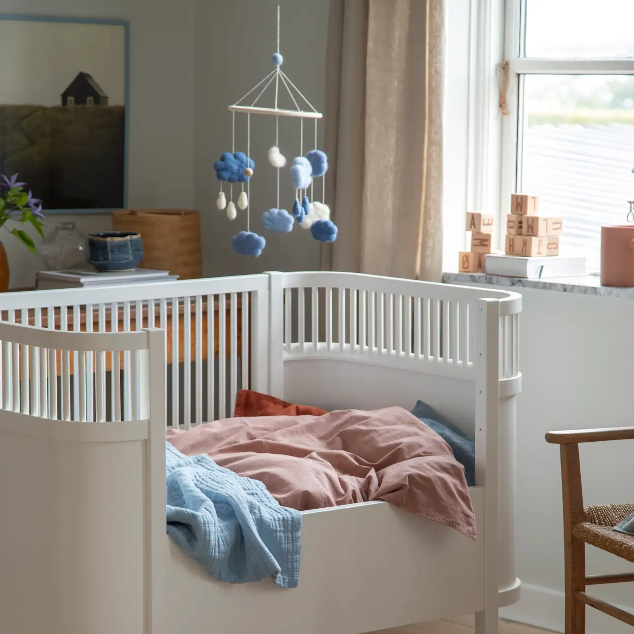 Karuzelka ma prosty i stylowy wygląd, który będzie pasował do większości pokoików i kącików dziecięcych. Osiem chmurek w ciepłych niebieskich odcieniach, z których niektóre mają małe krople deszczu, tworzą niemal magiczną atmosferę nad łóżeczkiem, łóżeczkiem lub przewijakiem dziecka. Części są połączone cienkim sznurkiem i przymocowane do drewnianego pierścienia. Zawieś karuzelkę bezpośrednio na haku w suficie lub przymocuj go do uchwytu lub metalowej ramy w baldachimie łóżka. Bujane chmurki przykują uwagę Twojego dziecka, pobudzą jego zmysły i zadziałają uspokajająco.