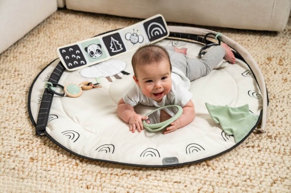 - Ruchy całego ciała - duży obszar do zabawy pozwala dziecku na rozciąganie swojego ciała, eksperymentowanie z ruchem oraz turlaniem się podczas gdy czarno-biała książeczka i inne elementy pomagają wydłużyć czas na brzuszku.