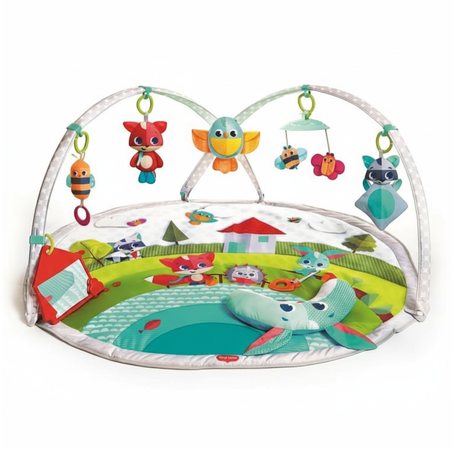 Duży obszar do zabawy pozwala dziecku na rozciąganie swojego ciała, eksperymentowanie z ruchem oraz obracaniem się, podczas gdy szeleszcząca poduszeczka, lusterko oraz zabawka ptaszek z funkcją nagrywania głosu pozwalają wydłużyć czas spędzany na brzuszku.
