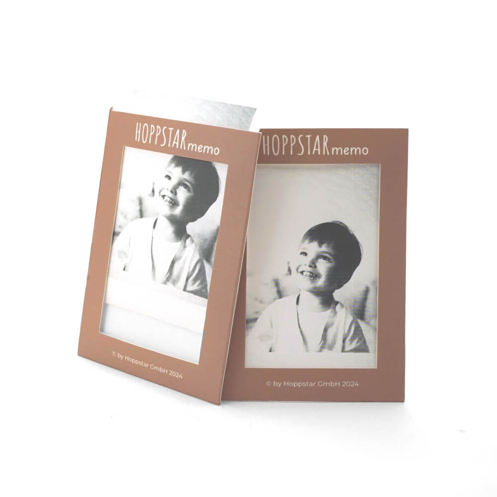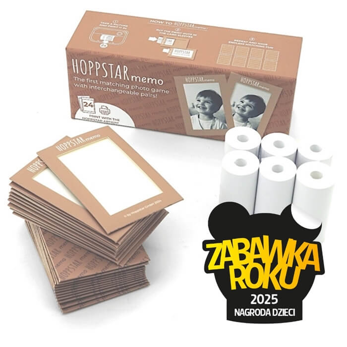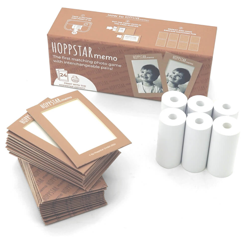 Zestaw Hoppstar Memo zawiera 24 koszulki na karty, z których stworzyć można 12 pasujących do siebie par. W opakowaniu znajduje się także 6 rolek papieru. Łącznie można na nich wydrukować aż do 224par! Dodatkowo koszulki na karty można wykorzystać jako ramki do zdjęć.