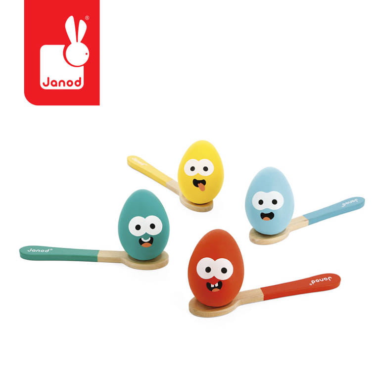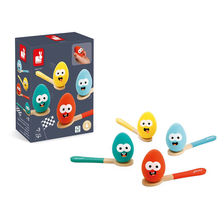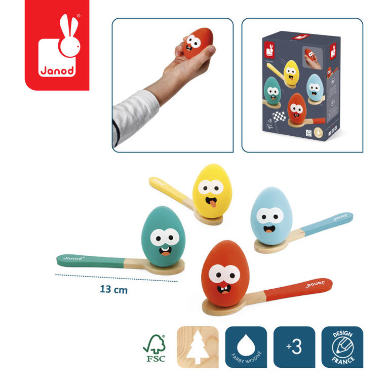 Gra wyścig z jajkami na łyżkach francuskiej marki JANOD to doskonała zabawa dla całej rodziny. Drewniane łyżki mają intensywne kolory uchwytów, które odpowiadają kolorom jajek – te zaś zdobią dodatkowo zabawne miny. Celem gry jest dotarcie do mety, nie upuszczając po drodze jajka, ułożonego na łyżce. To świetna gra zręcznościowa, idealna do zabaw plenerowych, np. na pikniki czy urodzinowe przyjęcia.