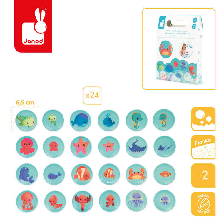 Składa się z 24 okrągłych wodoodpornych żetonów z 12 różnymi obrazkami, które należy dobrać w pary, odkrywając je i zapamiętując ich położenie. Na żetonach znajdują się m.in. narwal, krab, płaszczka, żółw czy rozgwiazda w wersji młodej oraz już dorosłej. Zabawka ta jest idealnym umilaczem czasu, spędzanego w wannie. Zaprojektowana we Francji. Zapakowana w estetyczne pudełko z uchwytem. Idealnie nadaje się na prezent.