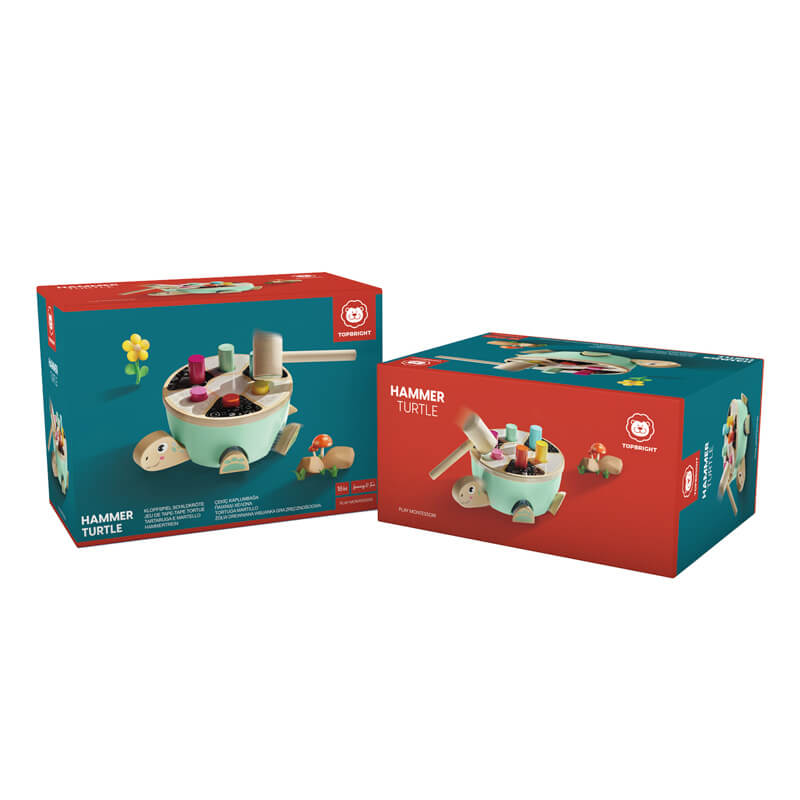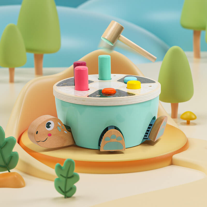 Gra składa się ze sporych rozmiarów żółwia z kolorowymi drewnianymi kołeczkami na grzbiecie oraz specjalnego narzędzia – drewnianego młoteczka. Gdy dzieci uderzają w kolorowe patyczki młotkiem, nogi, głowa i mały ogon wyłaniają się ze skorupy zwierzęcia. Nie jest łatwo trafić we właściwy! Na szczęście młotek jest poręczny dla małych dziecięcych rączek, a jego powierzchnia została pokryta filcem, który tłumi odgłosy uderzeń.