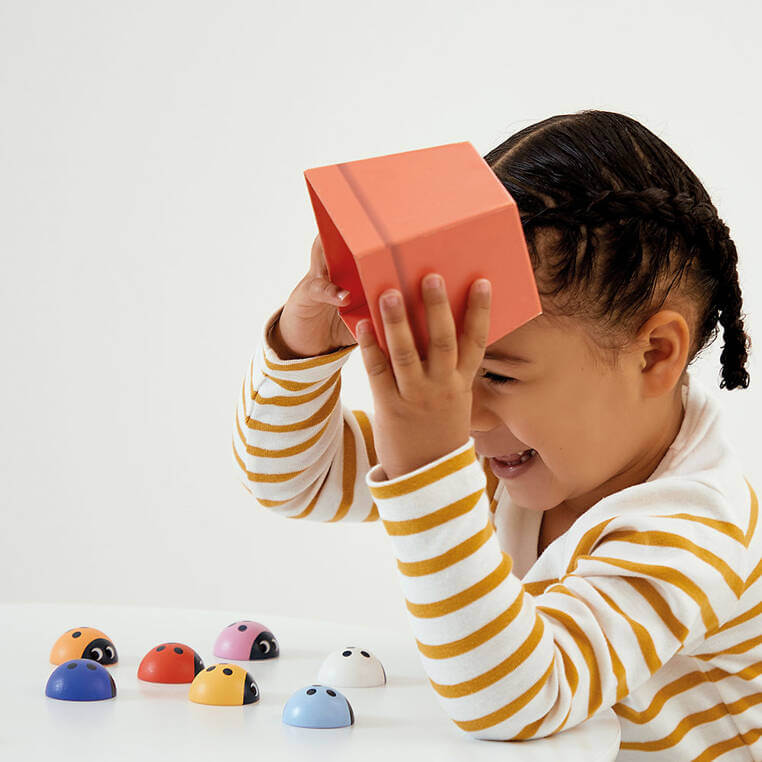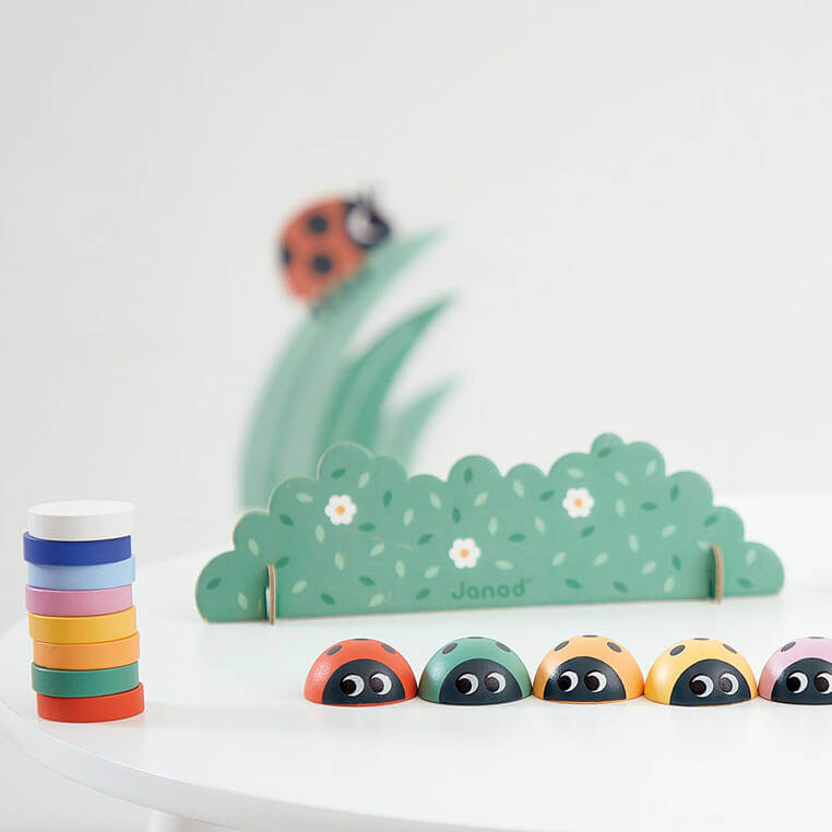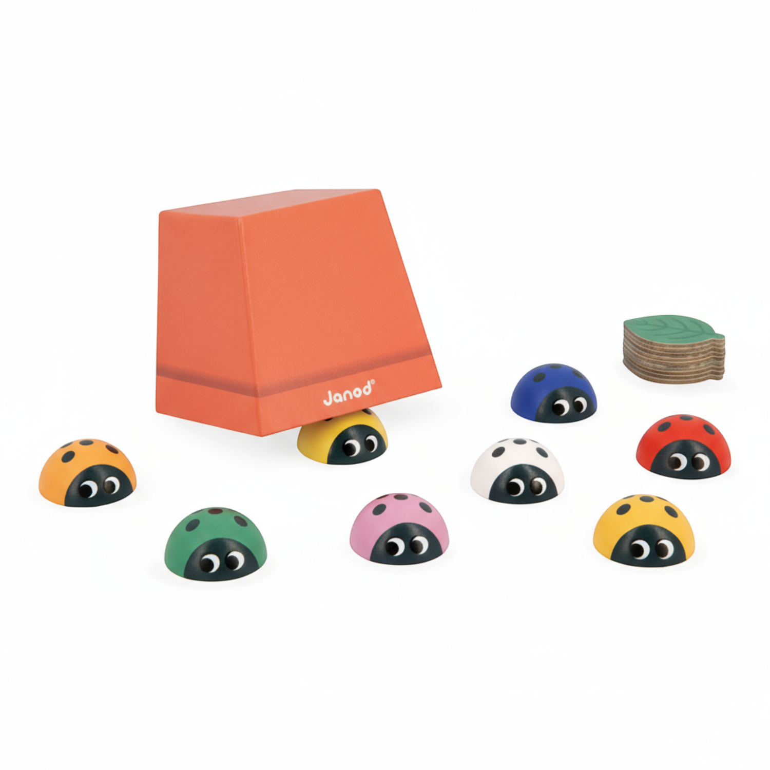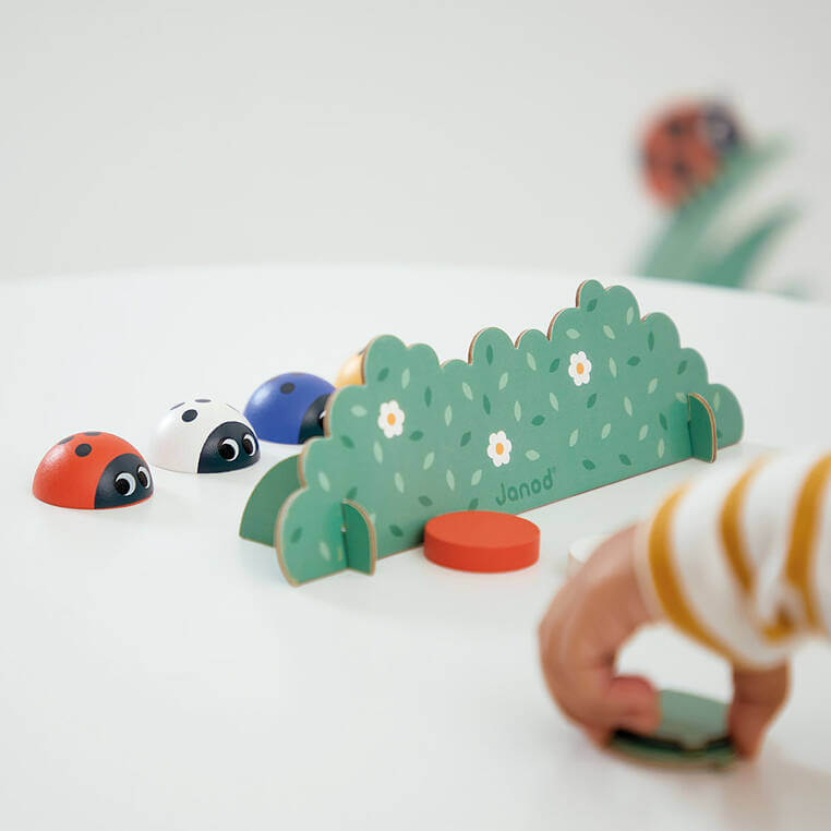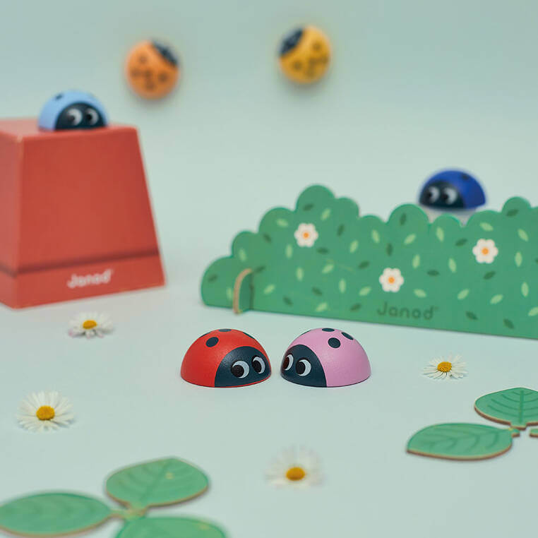 To wspaniała zabawa dla dwóch lub więcej osób – zarówno dzieci, jak i dorosłych. Zestaw zawiera 8 różnokolorowych drewnianych biedronek i 8 odpowiadających im kolorami drewnianych żetonów, kartonowe kwadratowe wiaderko, 2 przegrody-krzaczki, 4 podpórki oraz 10 kartonowych listków i woreczek na wszystkie drobne elementy. Istnieje kilka możliwości rozgrywek. Celem gry może być odtworzenie sekwencji kolorystycznej biedronek po drugiej stronie przegrody, zgadnięcie, jakie biedronki ukryte są w wiaderku, dopasowanie do siebie biedronek i żetonów i inne, w zależności od pomysłowości rodzica lub dziecka.