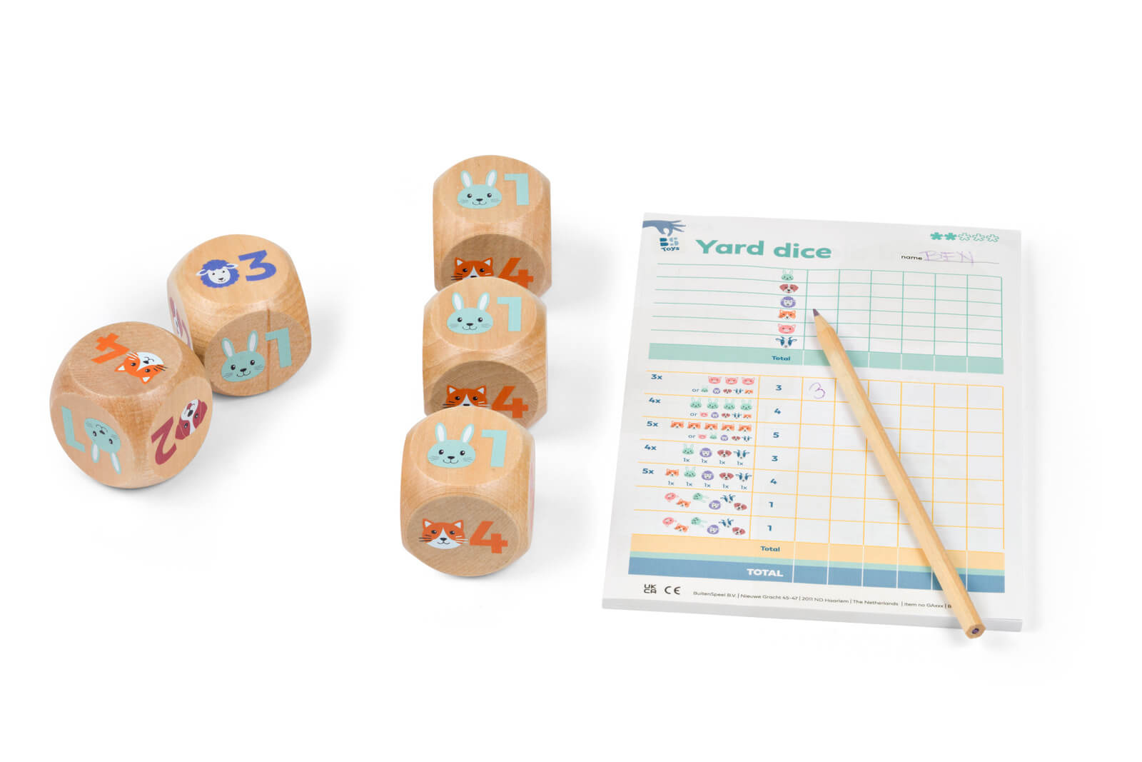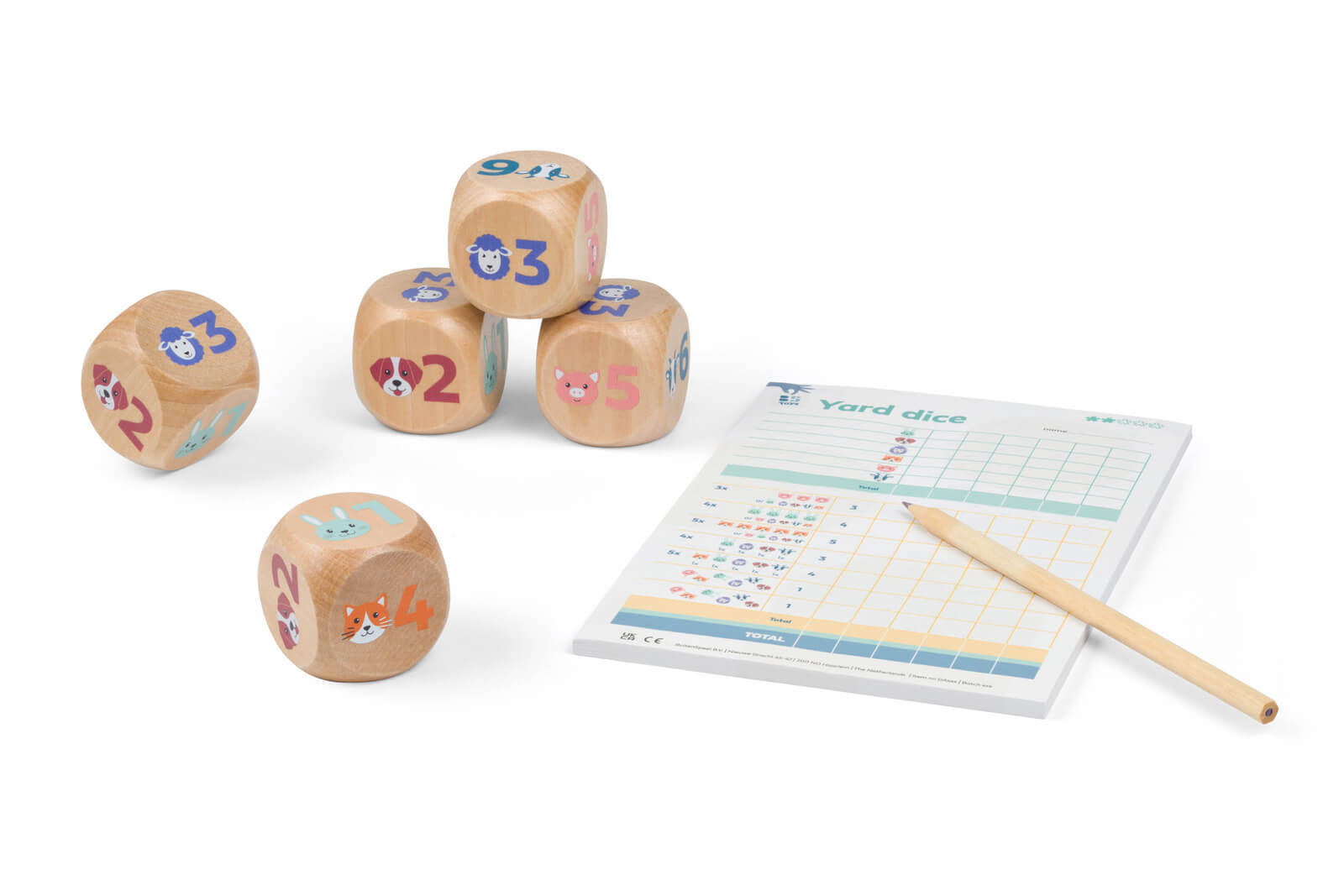 | Liczba elementów: | 5 dużych drewnianych kostek (5 × 5 cm), 1 notes z arkuszami wyników (A5), 1 ołówek |