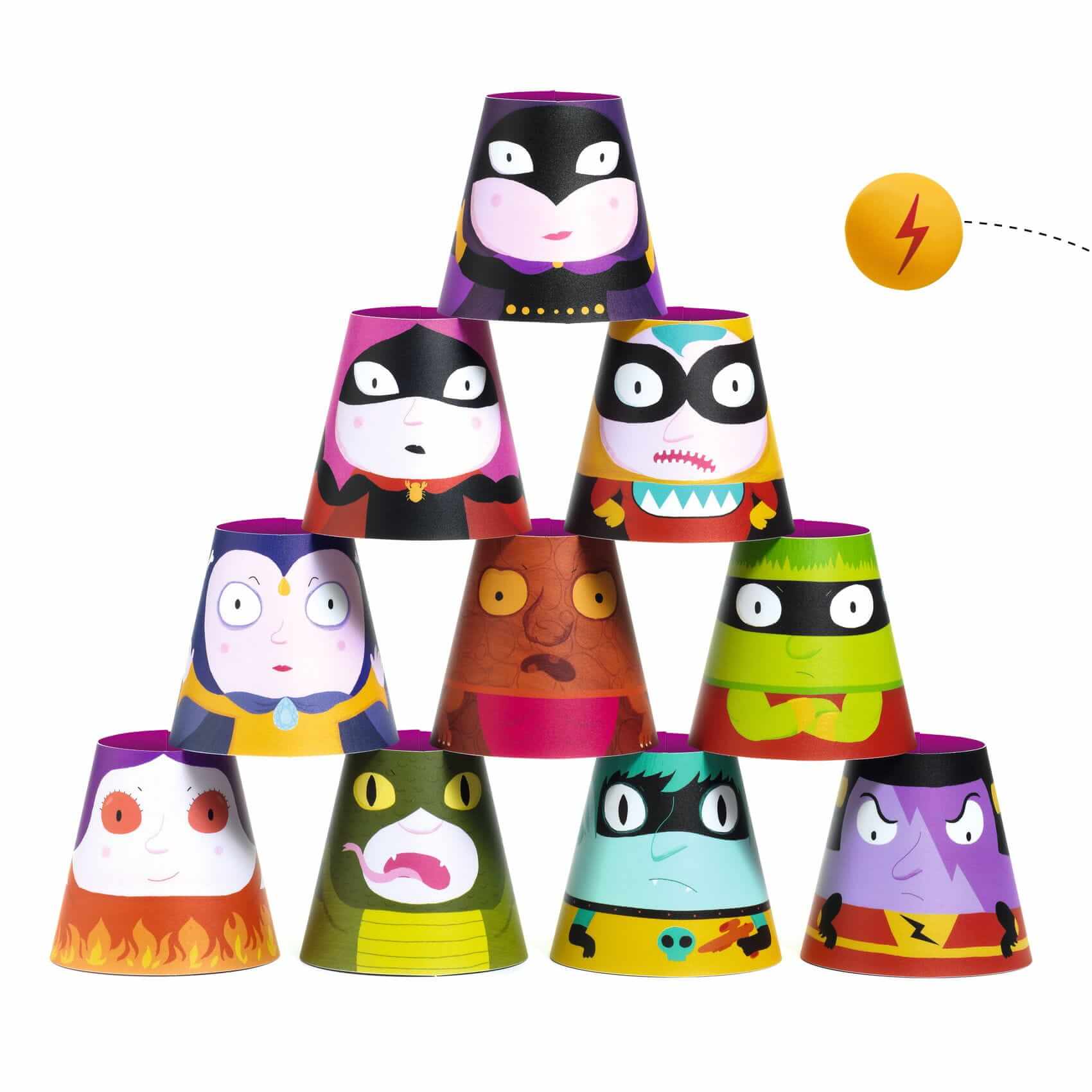 Świetna zabawa dla całej rodziny. Proste zasady zachęcą do zabawy nawet najmłodsze dzieci. Wystarczy ułożyć kubeczki do góry dnem w kształt piramidy i próbować strącić jak największą ilość w jak najmniejszej liczbie rzutów. Kubeczki są ilustrowane wizerunkami zabawnych postaci.