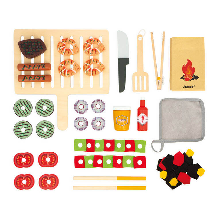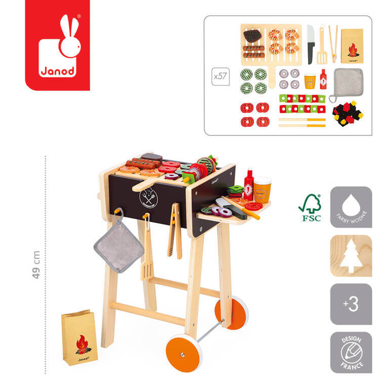 Pozwoli mu bezpiecznie uczestniczyć razem z rodzicem w codziennych czynnościach, poznawać kulinarne tradycje i rozwijać pasję gotowania. W skład zestawu wchodzą: duży drewniany grill na stabilnych nóżkach z dwoma nierysującymi posadzki kółkami, boczną półką, uchwytem i 3 wieszakami z przodu na narzędzia, „jedzenie” z filcu i drewna, w tym m.in. steki kiełbaski, krewetki, warzywa, sosy, a ponadto worek węgla, szpatułka i szczypce, uchwyt kuchenny, patyczki do szaszłyków oraz nóż. Zestaw zaprojektowano we Francji. Idealnie nadaje się na prezent.