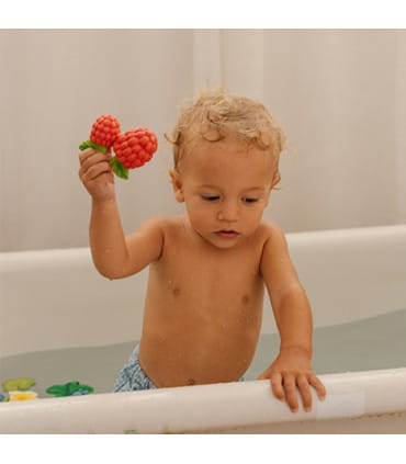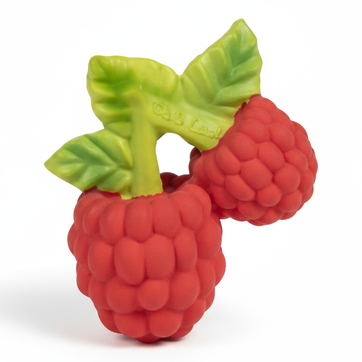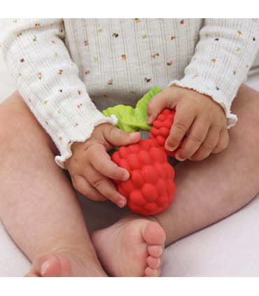 Piękny, naturalny kauczukowy gryzak - zabawka Oli and Carol Malina Valery masuje dziąsła dziecka, przynosząc ulgę podczas ząbkowania. Apetyczny owoc maluch zabierze także do kąpieli!