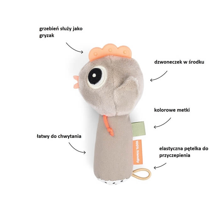 Dzięki elementom sensorycznym, takim jak grzechotka i różnorodne faktury, stymuluje zmysł słuchu i dotyku. Grzebień koguta można używać jako gryzaka, idealnego do łagodzenia swędzenia dziąseł podczas ząbkowania.