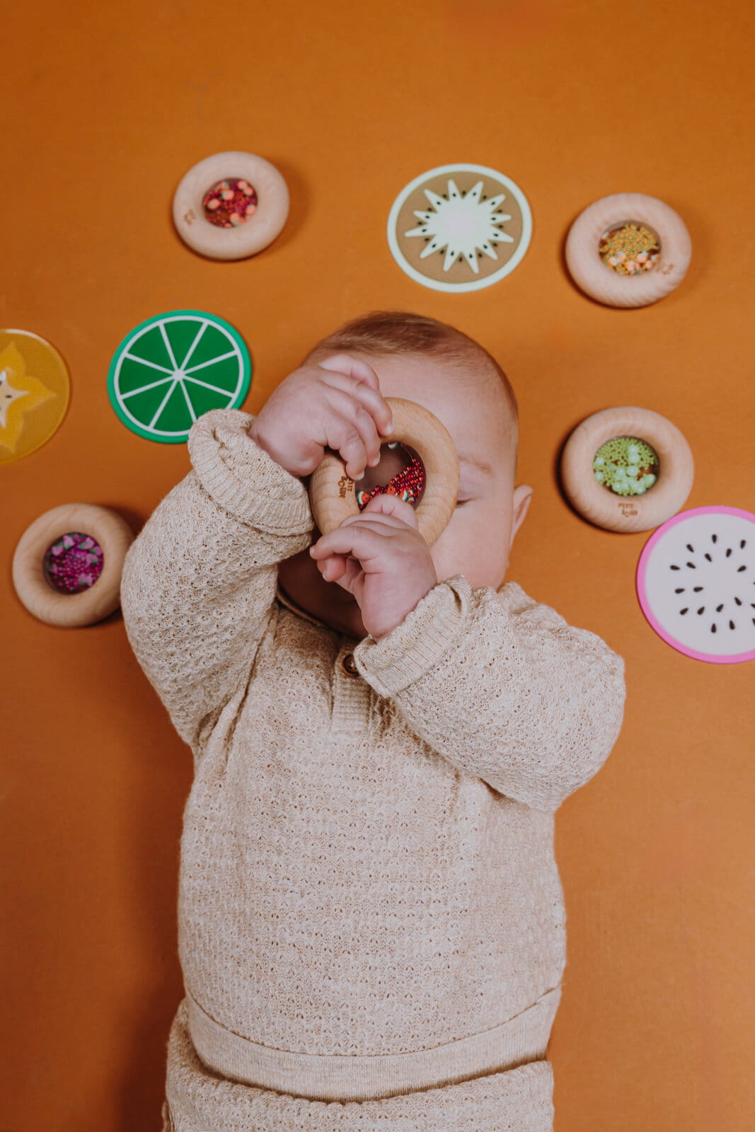 Grzechotka sensoryczna z tej kolekcji to idealny wybór dla maluchów od 6. miesiąca życia. Wykonana z wysokiej jakości drewna bukowego, ma okrągły kształt przypominający pączka z grzechoczącym nadzieniem w środku. Kuleczki oraz kolorowe elementy w kształcie owoców i warzyw przemieszczają się, tworząc delikatne dźwięki, które stymulują zmysły dziecka. Naturalne drewno jest bezpieczne oraz łatwe do chwycenia.