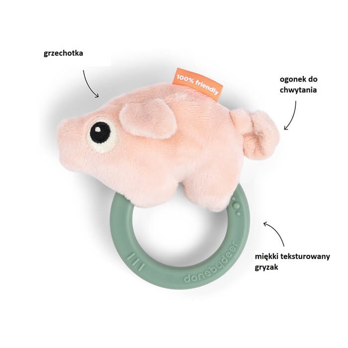 Gryzak jest idealny do łagodzenia swędzących dziąseł, a grzechotka i różnorodne struktury materiału zabawki zapewniają stymulację i zachęcają do eksploracji.