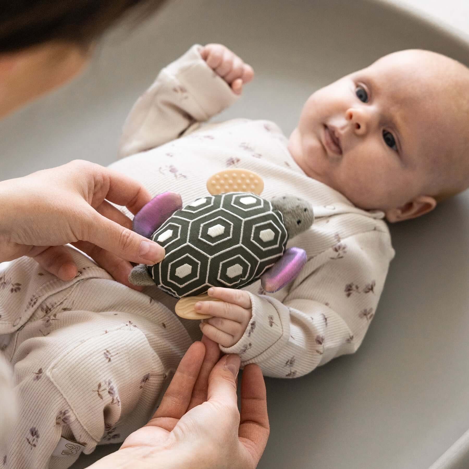 Stymuluj wszystkie zmysły swojego maluszka z Turbo Żółwikiem – uroczą grzechotką edukacyjną z lusterkiem na brzuszku