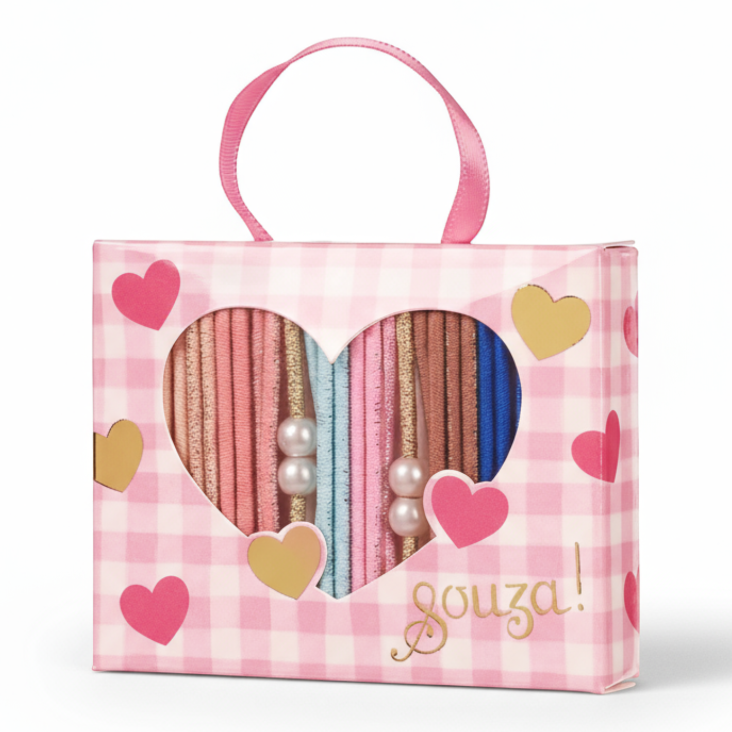 W skład zestawu wchodzą gumki matowe i z brokatową nitką w odcieniach niebieskiego, różu, złota czy brązu, w tym kilka z ozdobnymi perełkami. Gumki są mocne i solidne. Idealne do tworzenia fryzur zarówno na przyjęcia, jak i na co dzień. Zapakowane są w urocze różowe pudełeczko z okienkiem. Nadają się także na prezent.