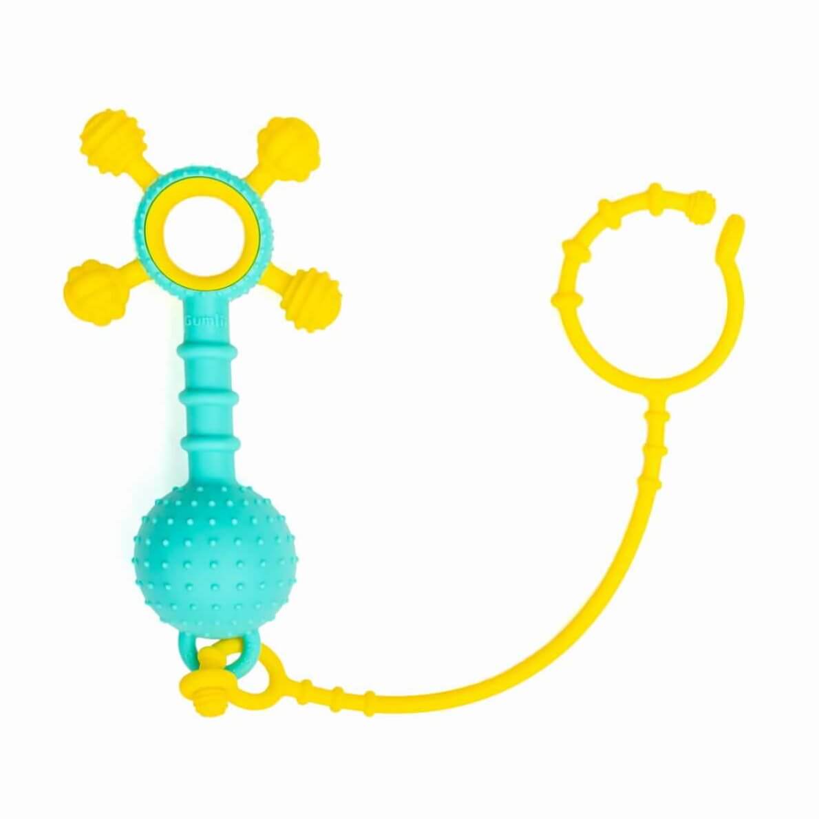 Do grzechotki Gumlii dołączony jest silikonowy sznureczek/zaczepka, dzięki któremu można Gumlii przyczepić do wózka, krzesełka, a sznureczek będzie zabezpieczał grzechotkę przed upadkiem na ziemię. Silikonowy sznureczek/zaczepka nie jest zabawką i można go wykorzystać do zaczepienia innych gryzaków i grzechotek!