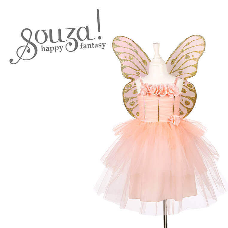 Sukienka ma klasyczny krój na ramiączkach i gumkę w pasie. Jest miękka i wsuwana przez głowę. Zachwyca dbałością o detale. Góra tej różowo-złotej sukienki jest dwustronna: z przodu ma upięcie z marszczonego tiulu, trzy ozdobne złote paski i kwiaty przy dekolcie oraz jeden w talii, z tyłu jest aksamitna i gładka. Dół stanowi spódniczka z podszewką i kilkoma warstwami tiulu w różnych długościach. W skład zestawu wchodzą także półprzeźroczyste jasnoróżowe skrzydła ze złotymi wzorami. Można je nosić razem z sukienką lub osobno. Zakładane są na wygodne gumowane ramiona. Strój jest efektowny i komfortowy do noszenia. To idealne przebranie na bal przebierańców czy Sylwestra. Sprawdzi się także jako prezent.