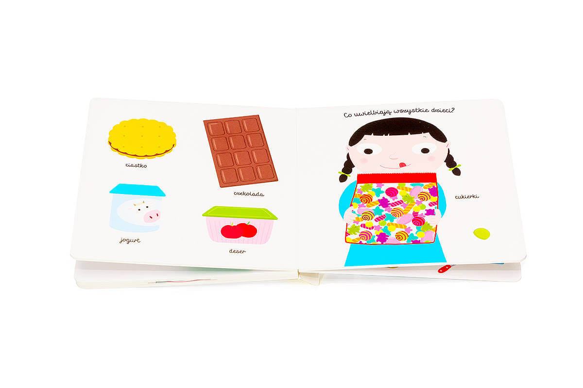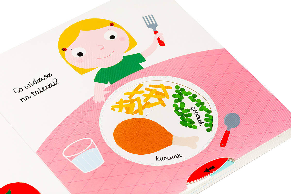Dzięki książce z ruchomymi elementami „Jedzenie” dziecko pozna nazwy pożywienia – warzyw, owoców, nabiału. Maluch pozna odpowiedzi na pytania m.in. o to który owoc jest żółty oraz co można pić z butelki.