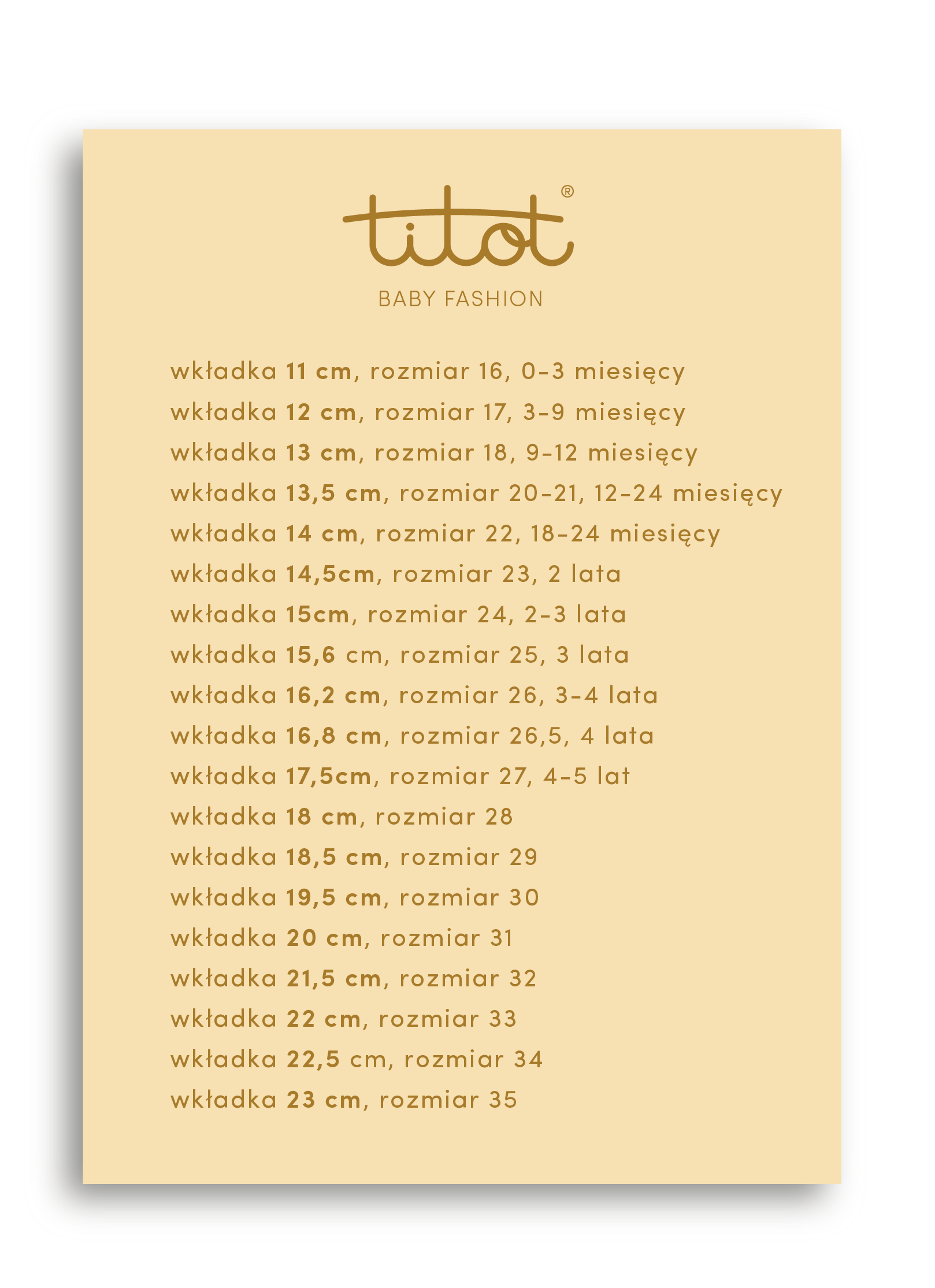 Titotki nosimy metkami na zewnątrz, został umieszczony na nich rozmiar, z łatwością więc możesz zamówić kolejny, gdy te będą za małe.
