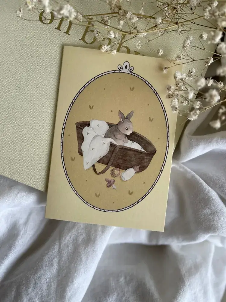 Projekt wykonany przez ilustratorkę Agnieszkę Kumańską przedstawiający malutkiego zajączka w koszu Mojżesza, obraz wywołuje czułość i beztroskę nowo narodzonego życia, co czyni ją idealnym wyborem na taką okoliczność. Motyw wykonany w stylu retro, przyciąga wzrok i serce dodając kartce ponadczasowej elegancji. Każda kartka jest świadectwem ręcznej pracy artystycznej, co nadaje jej niepowtarzalny charakter.
