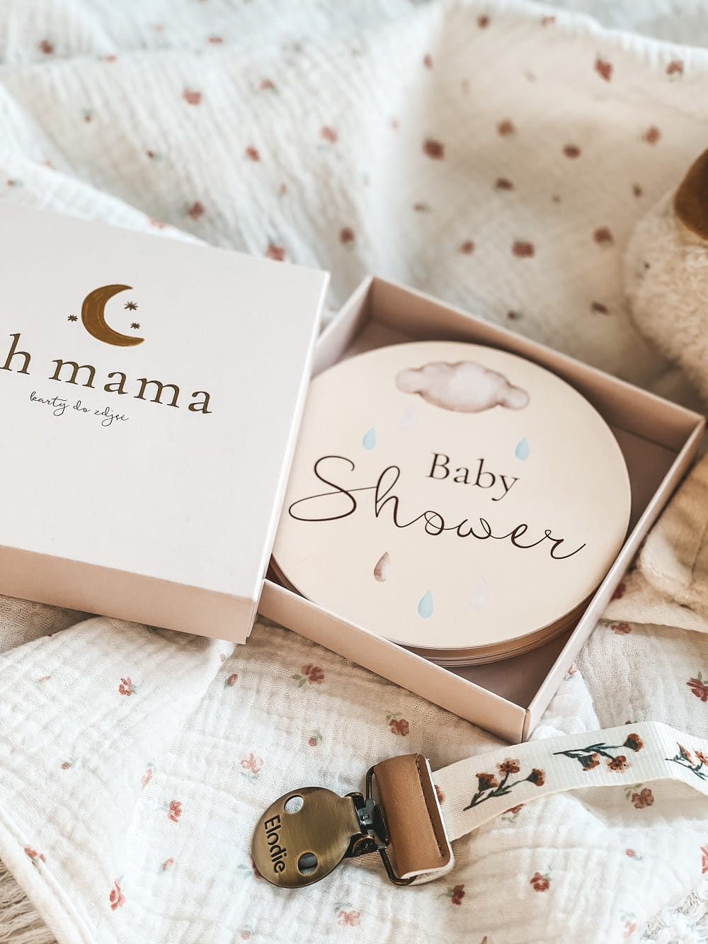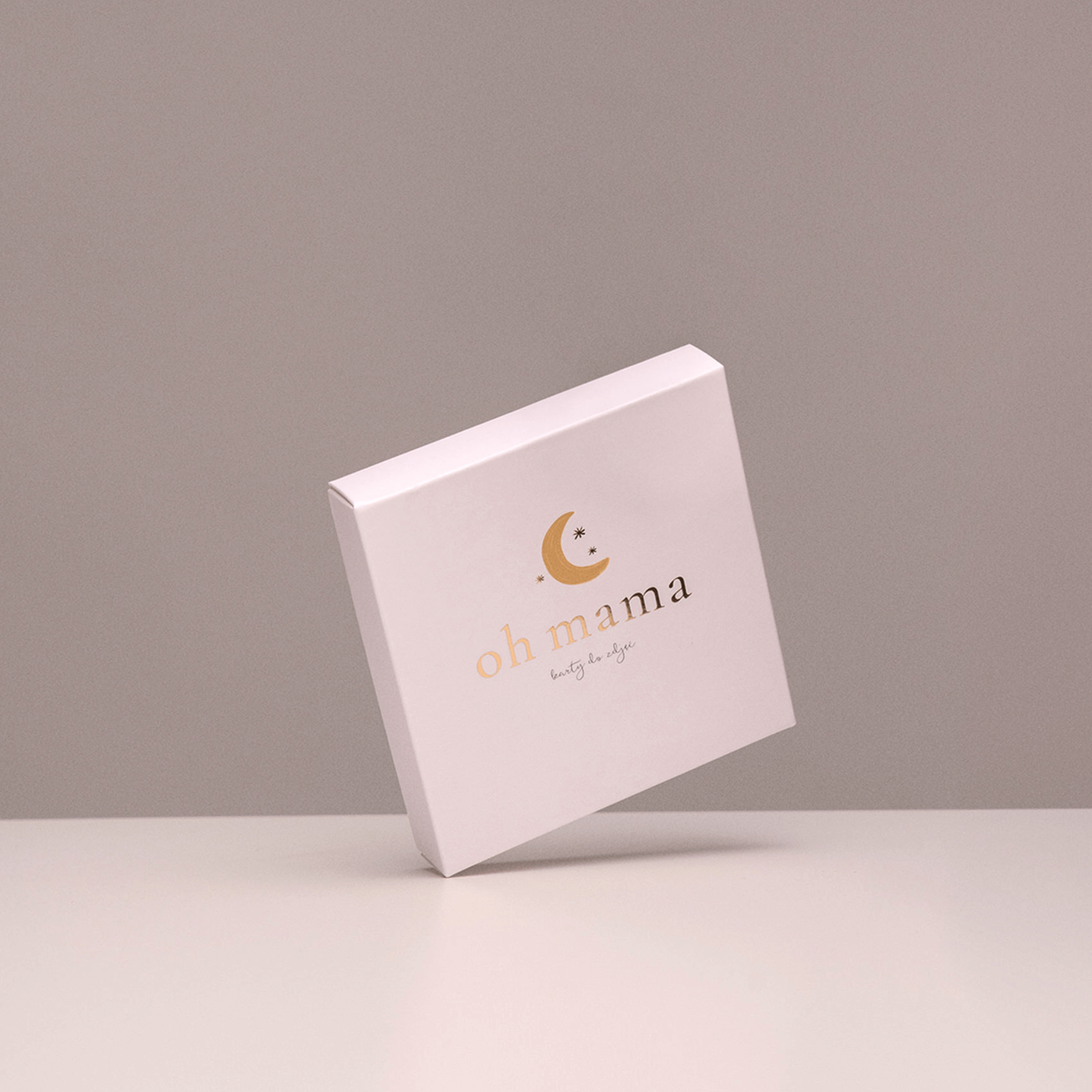 - Całość zapakowana w piękne, pamiątkowe sztywne pudełko ze złotym tłoczeniem napisu „oh mama” i w delikatnym odcieniu pudrowego różu.