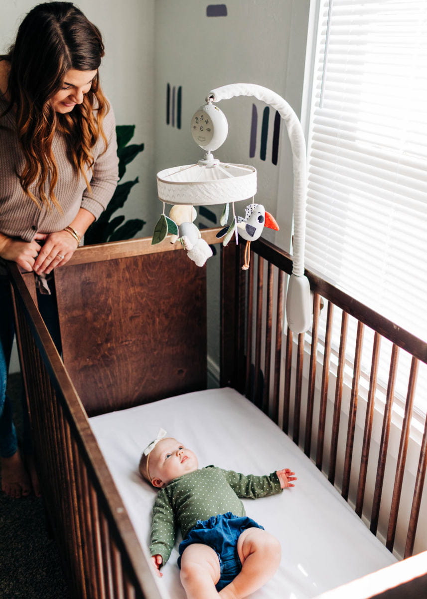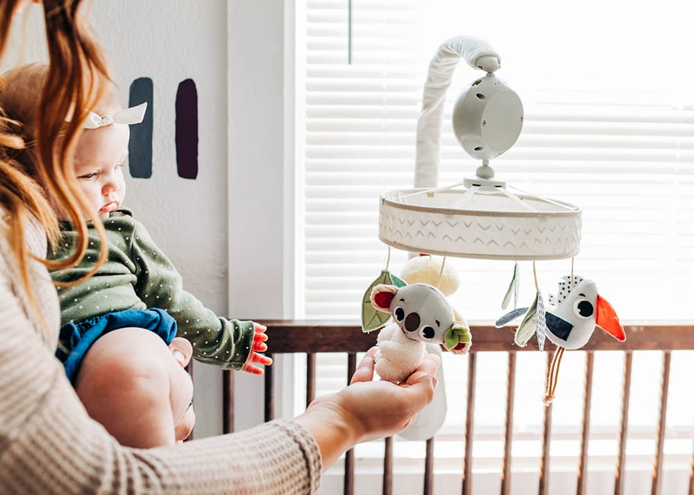 Włącz muzykę oraz funkcję obracania się karuzeli - to połączenie pomoże przygotować malucha do snu, a przycisk uruchamiający tryb uciszania, pomoże dziecku zasnąć samodzielnie.
