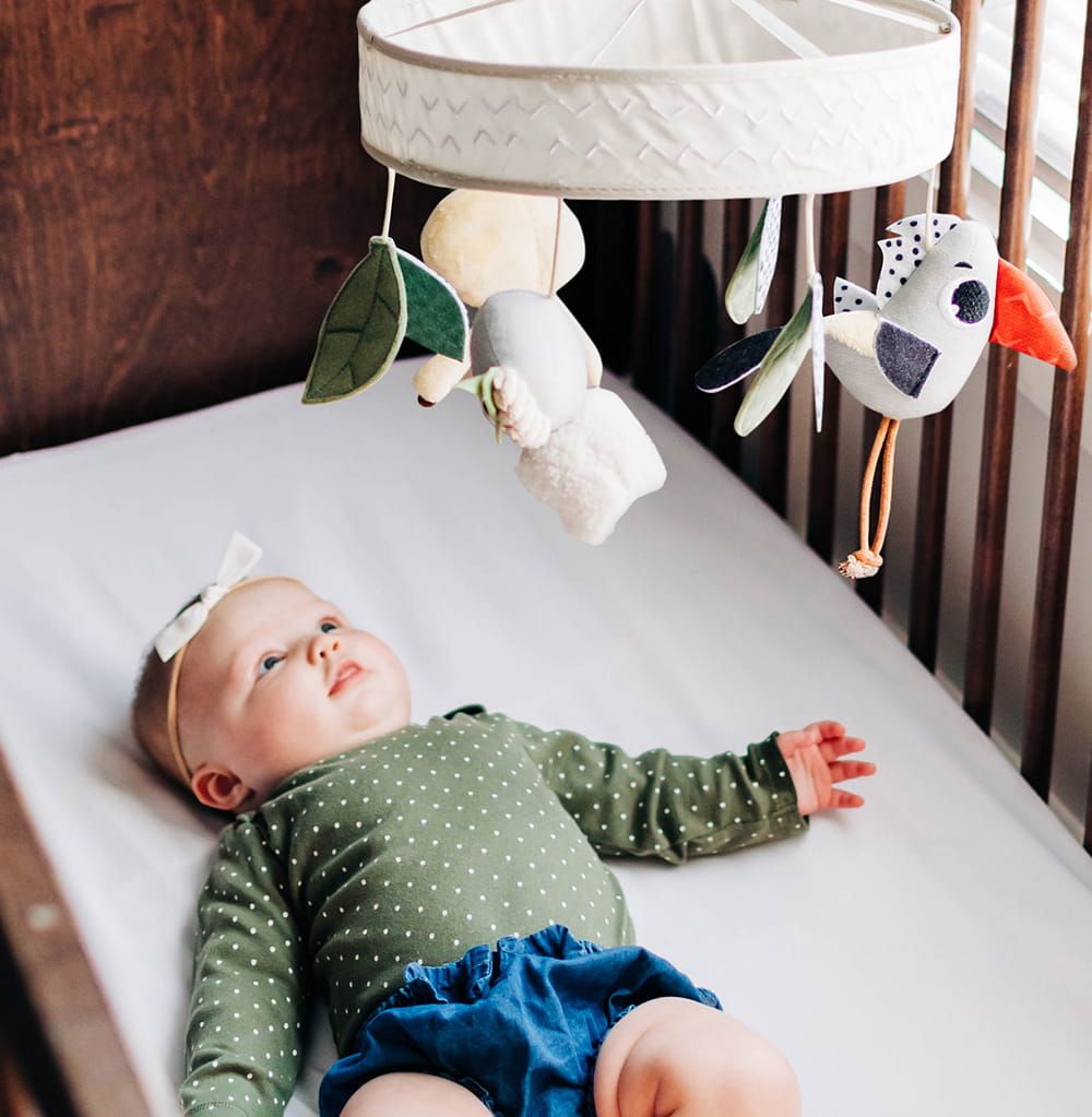 Połóż dziecko w łóżeczku pod karuzelą i pozwól mu cieszyć się spokojną, odprężającą atmosferą, dzięki kojącym melodiom i ruchom. Zobacz jak Twoje dziecko reaguje na różne dźwięki, aby zobaczyć, który z nich najbardziej mu odpowiada.