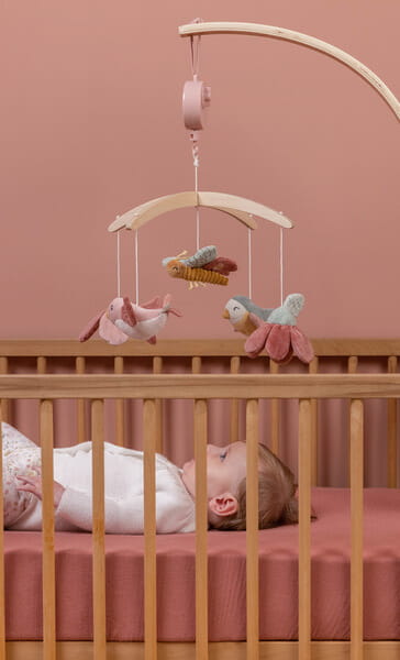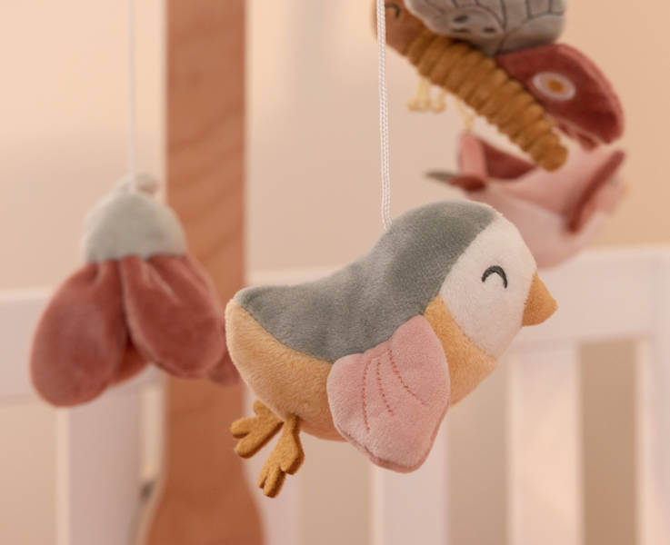 Karuzela to solidna zabawka, która dzięki specjalnie wyprofilowanemu, drewnianemu pałąkowi jest stabilna i trwała. Łatwy montaż do dziecięcego łóżeczka. Na karuzeli znajduje się 5 zabawek z kolekcji Flowers & Butterflies takich jak: dwa kwiatki, ptaszek Olivia, wróbelka Abby i motylek Lily. Karuzela, po nakręceniu gra melodię „Somewhere Over the Rainbow”. Karuzela pozwala maluchowi na rozwój sensoryczny, poznawczy oraz ćwiczy koordynację. Niemowlęta uwielbiają obserwować poruszające się postacie. Stanowi uzupełnienie z pozostałymi produktami z kolekcji Flowers & Butterflies. Wspaniały pomysł na prezent.