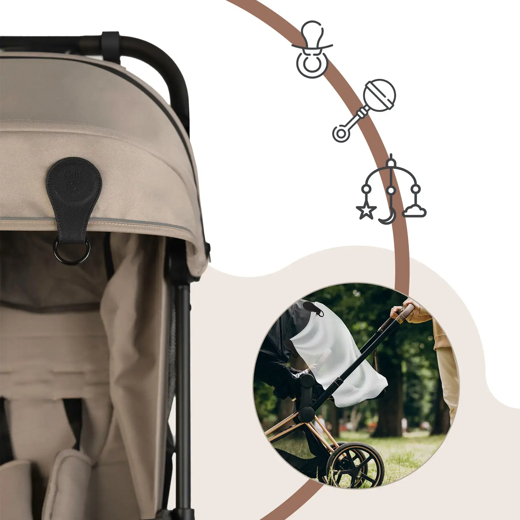 - Na spacerze – do przypięcia pieluszki, muślinu lub osłony przeciwsłonecznej, chroniącej przed słońcem i wiatrem