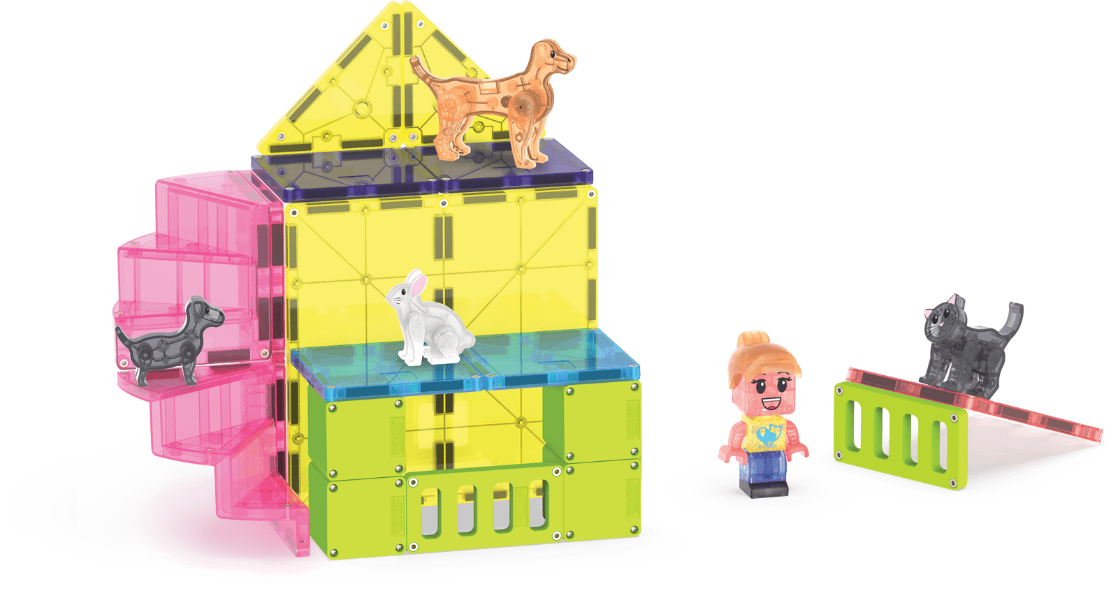 W skład zestawu wchodzą: 50 magnetycznych elementów, w tym figurka kotka, królika, psa, szczeniaczka, figurka opiekuna zwierząt Mix & Match oraz zjeżdżalnia.