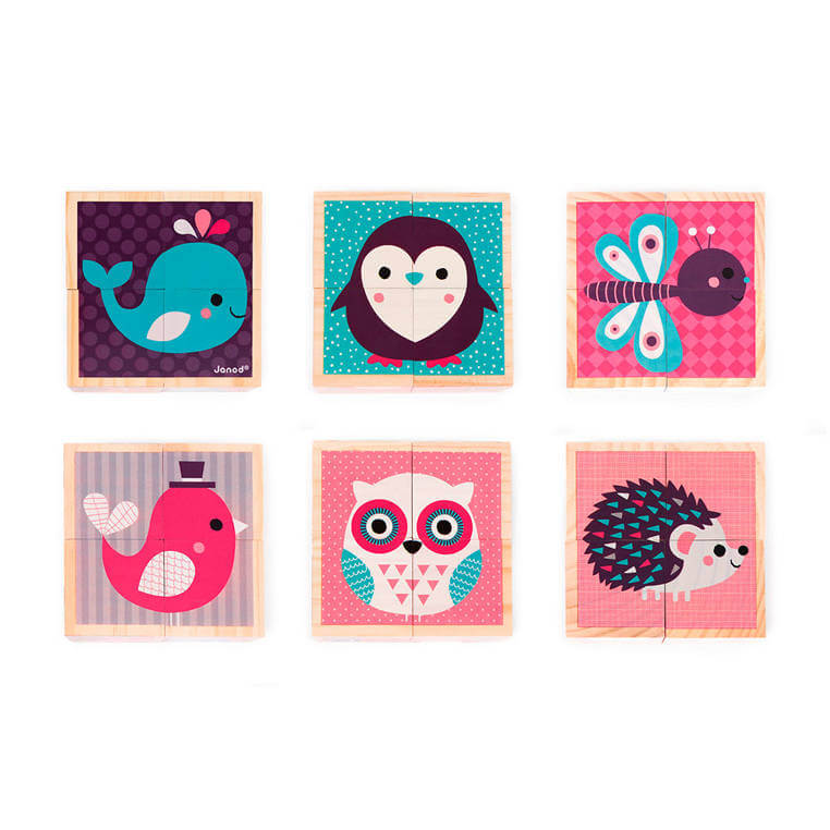 Zestaw składa się z 4 drewnianych klocków, a komplet umożliwia ułożenie 6 różnych obrazków z postaciami zwierząt: jeża, pingwina, wieloryba, sowy, ptaka i ważki. To doskonała układanka dla małych dzieci na rozpoczęcie przygody z puzzlami. Klocki zapakowane są w estetyczne, kartonowe pudełko - idealnie nadają się na prezent.