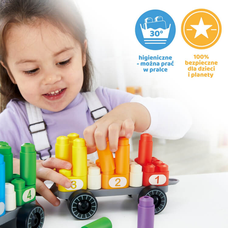 - Bezpieczeństwo: Klocki wykonane z nietoksycznego polietylenu (LD-PE/HD-PE) są całkowicie bezpieczne dla dzieci. Możliwość prania w pralce (do 30°C) ułatwia utrzymanie higieny.