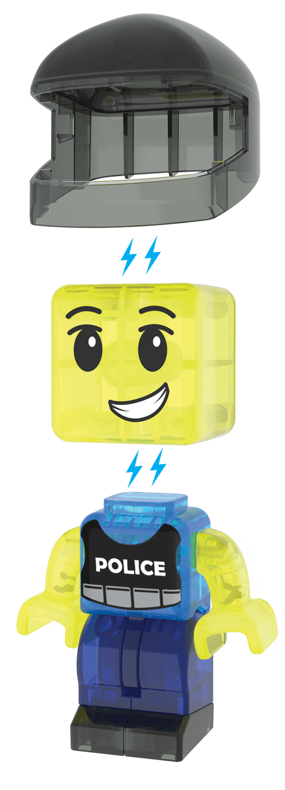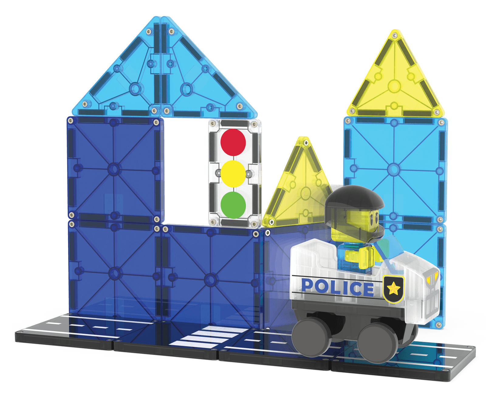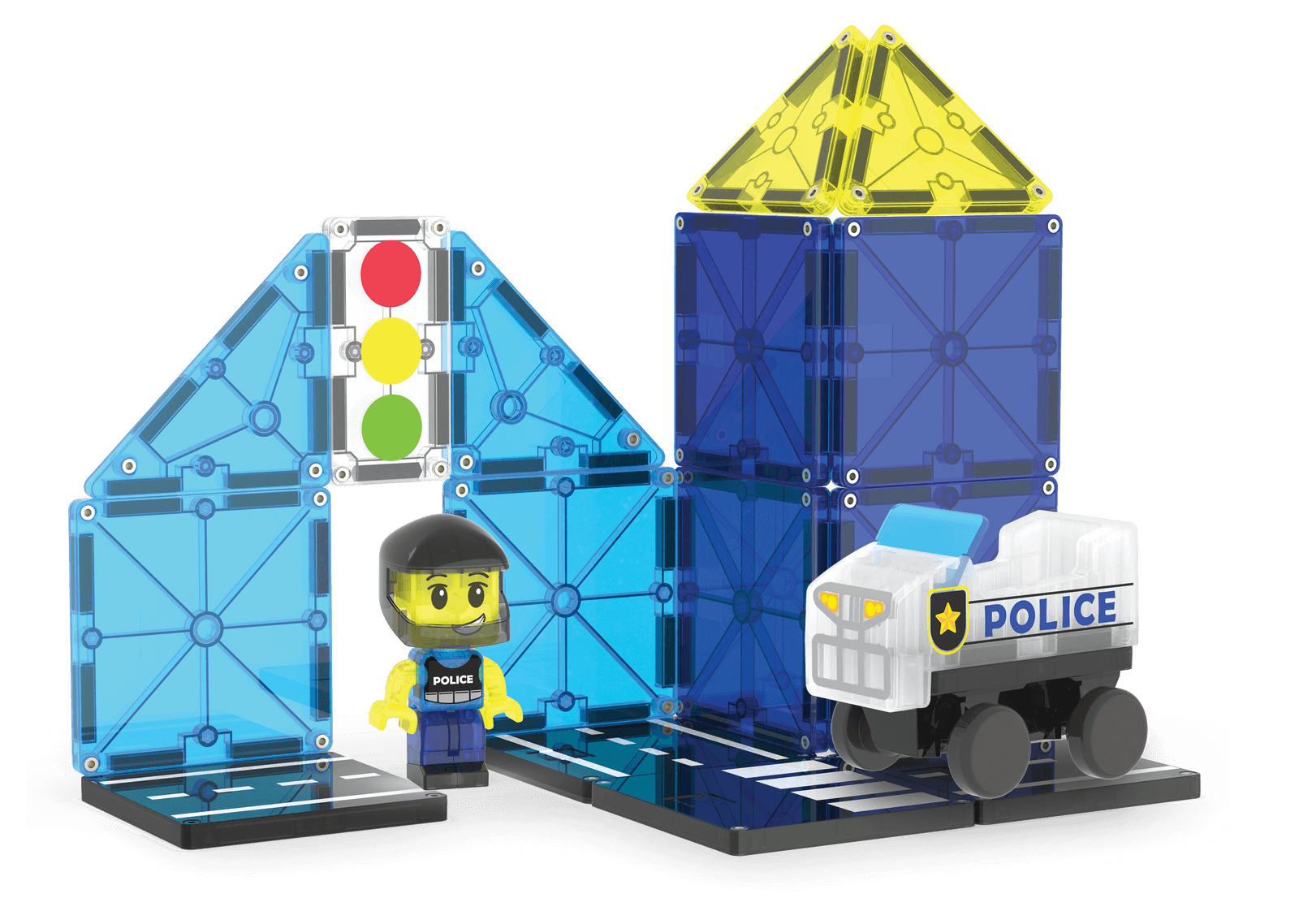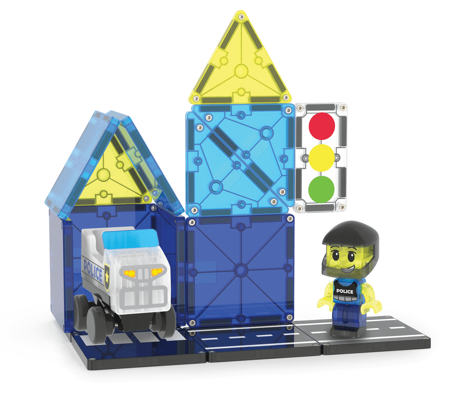 W skład zestawu wchodzą: 20 magnetycznych elementów, w tym figurka policjanta Mix & Match.