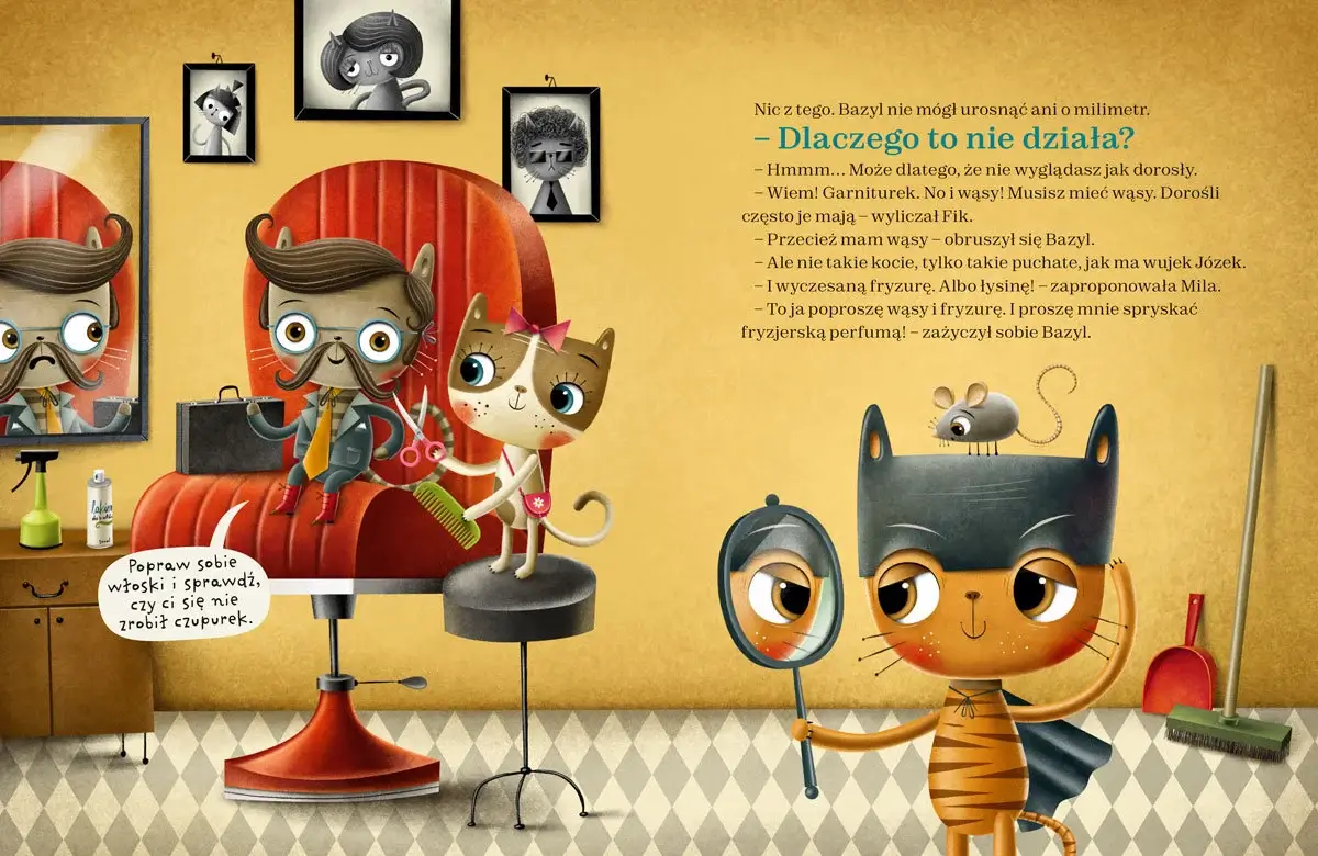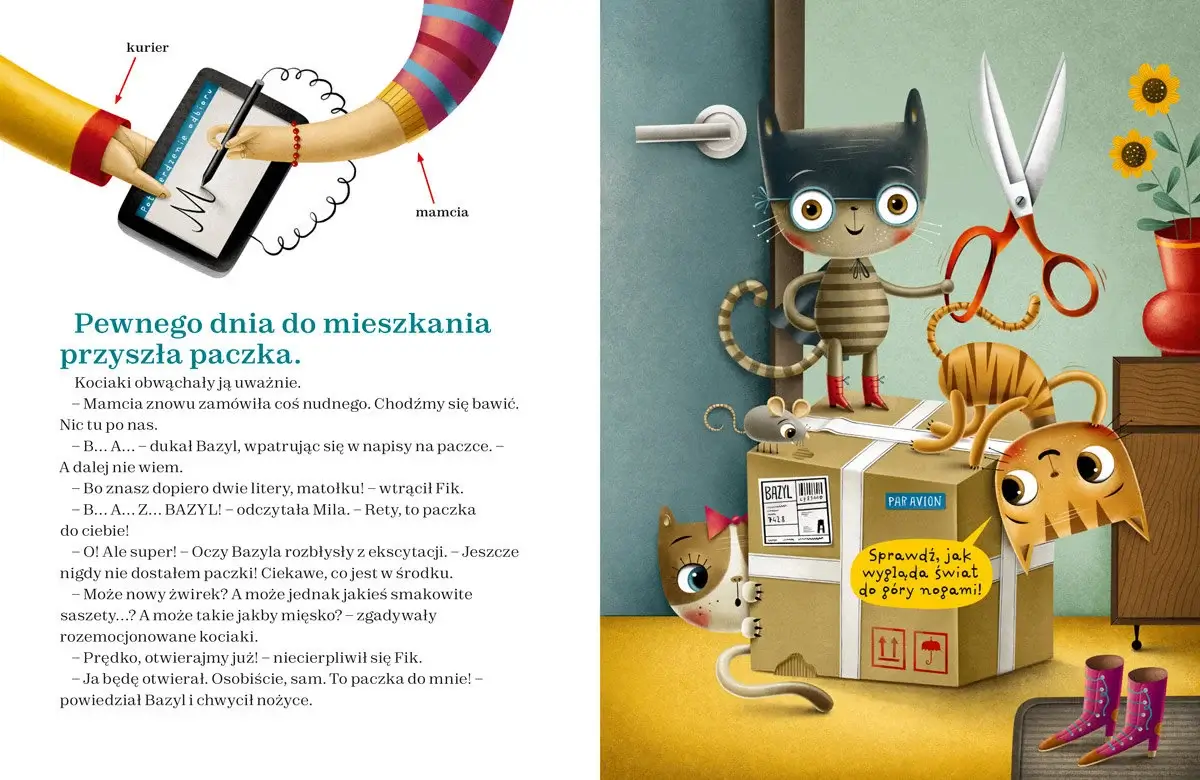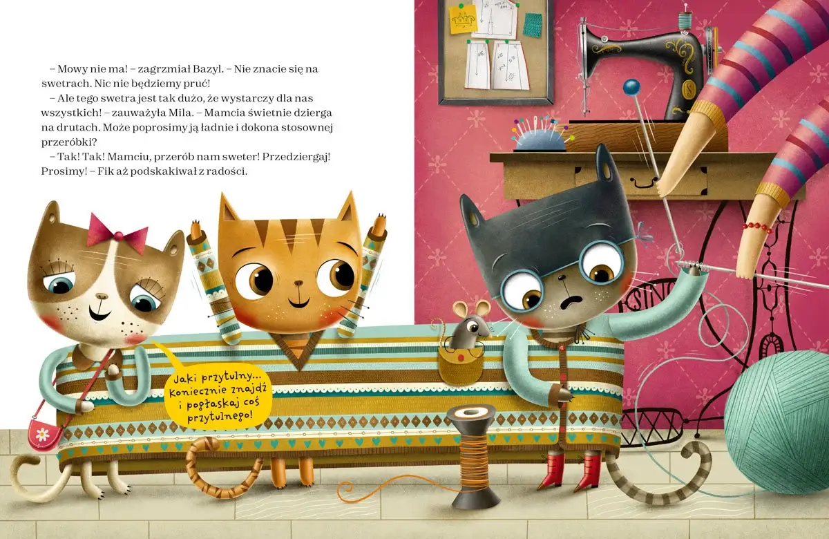 Kociaki łobuziaki to niezłe gagatki! Nawet nie podejrzewacie, do czego dojdzie, gdy Bazyl dostanie paczkę z obłędnym, absolutnie fantastycznym i mięciusim swetrem… Co prawda sweter jest na niego dużo za duży, ale to nie kłopot. Przecież Bazyl może urosnąć! Wystarczy, że na przykład stanie się dorosły. Musi tylko leżeć na sofie i być ciągle zmęczony albo mieć dorosłą wyczesaną fryzurę, albo pozjadać wszystkie rozumy, jak dorośli. Jak to się skończy? Przekonajcie się sami.
