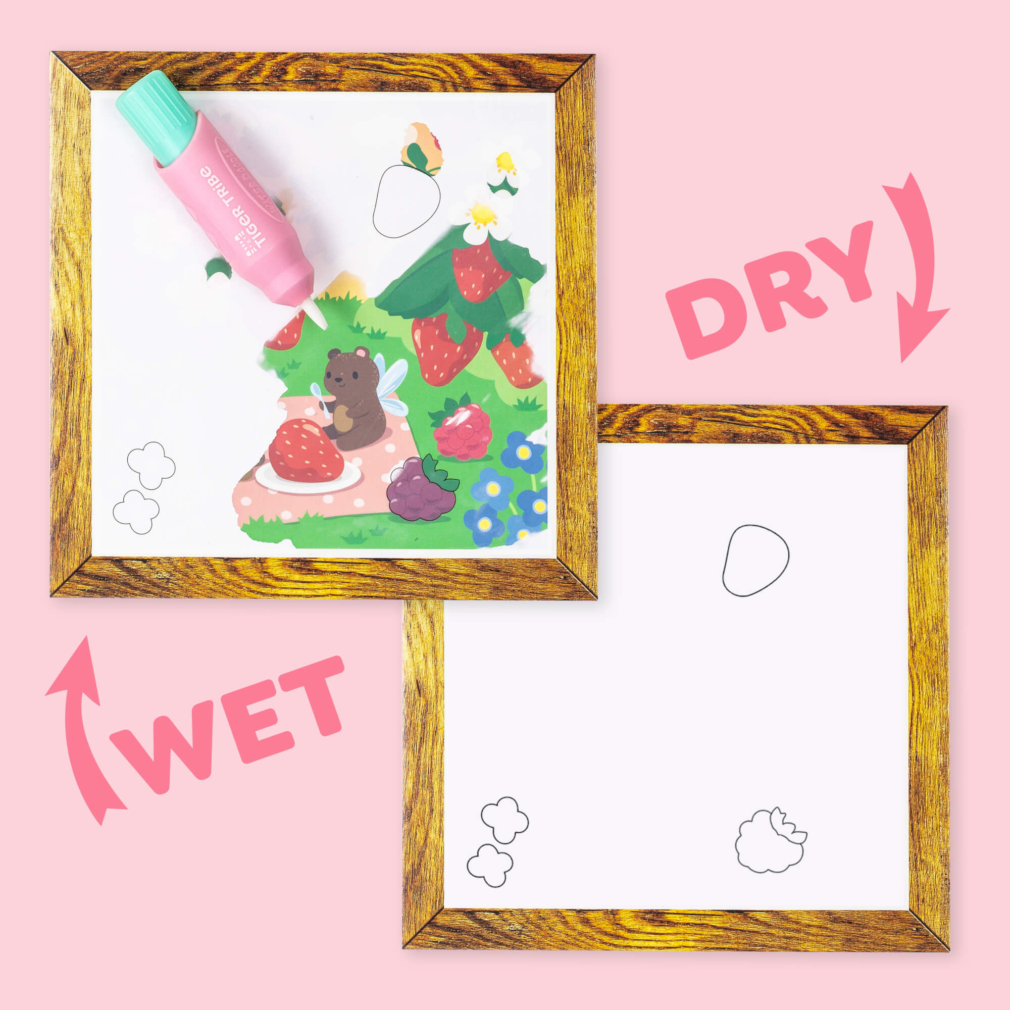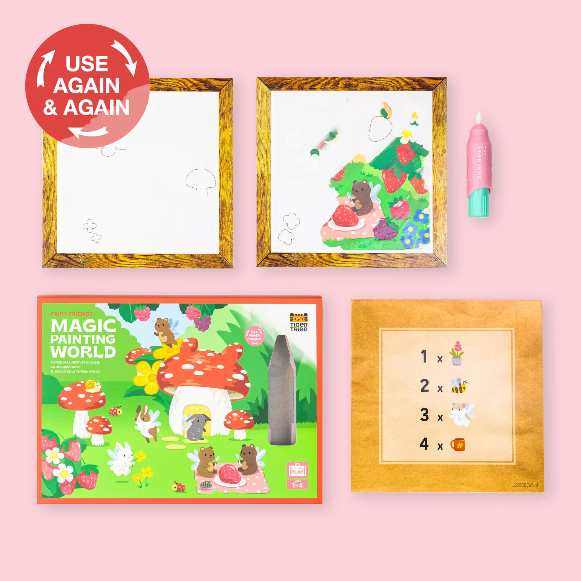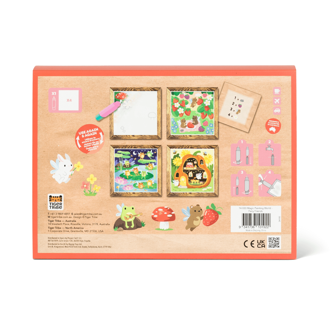 Maluchy mogą odkrywać malowanie bez bałaganu dzięki temu przenośnemu zestawowi. Kolorowanka wodna to idealne wprowadzenie do malowania dla maluchów. Ukryte obrazki można odkryć przy użyciu samej wody za pomocą grubego pędzla wodnego o idealnym rozmiarze dla małych rączek. Po wyschnięciu sceny znikają, dzięki czemu dzieci mogą bawić się w kółko! Do odkrycia są 4 obrazki z motywami leśnych wróżek. Z tyłu każdego obrazka są zadania - na każdej planszy z ilustracjami należy odszukać i policzyć podczas malowania określone elementy. Gwarantuje to wiele godzin zabawy!