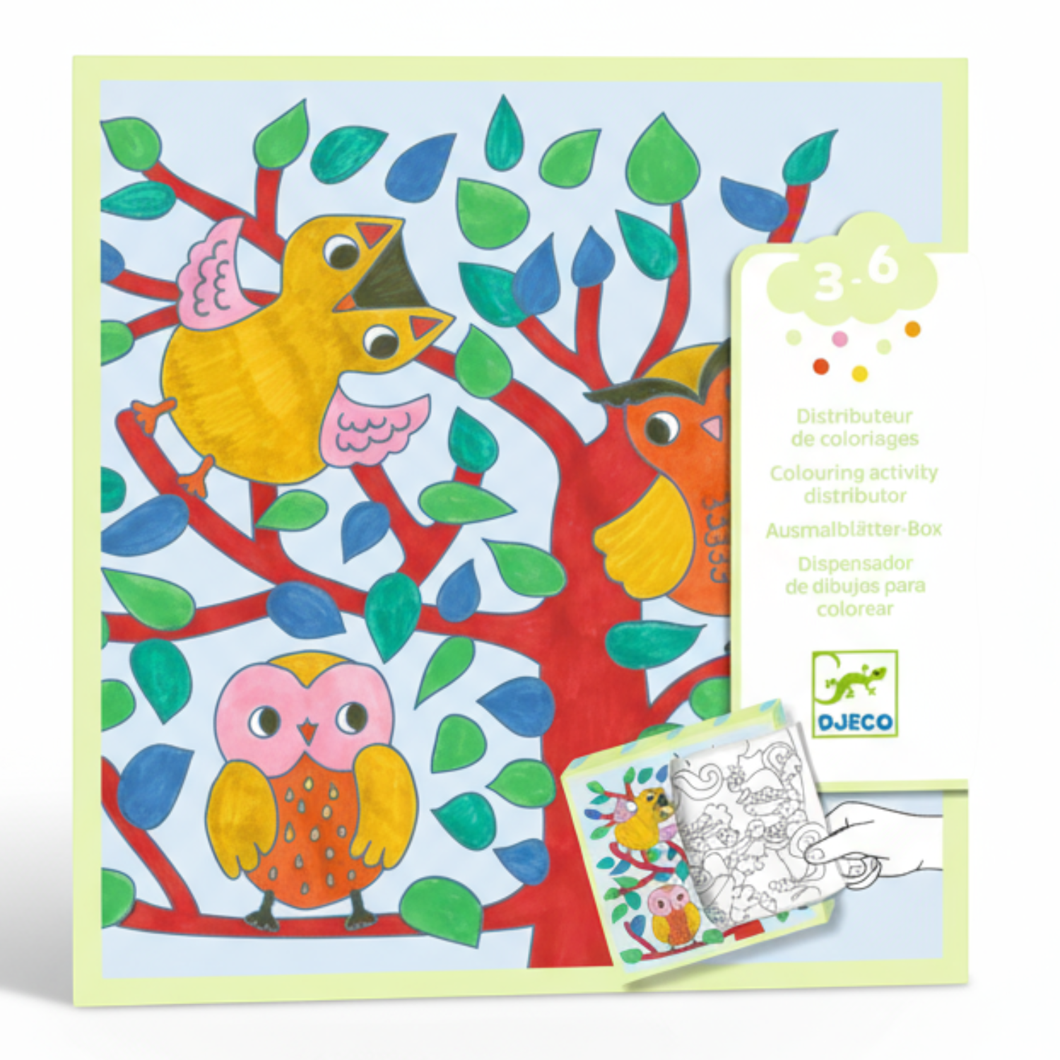Zrób otwór w pudełku w przygotowanym wcześniej miejscu i wyjmij pierwszy arkusz: czy będzie to kolorowanka czy gra? Przekonaj się sam! Zestaw zawiera 10 arkuszy do pokolorowania i 10 arkuszy z grami związanymi z lasem. Wykonany z papieru i kartonu posiadającego certyfikat FSC®.