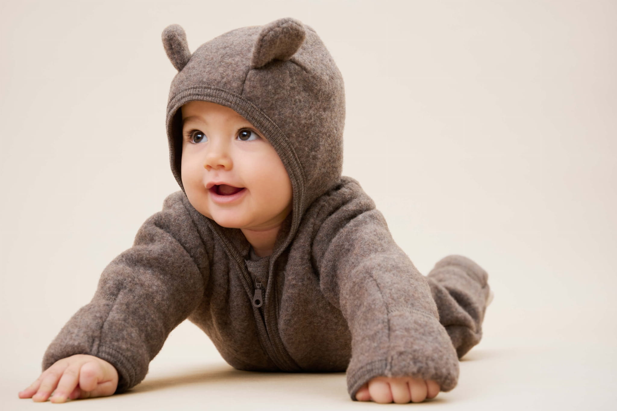 Kombinezon Huttelihut ma przyszyty kaptur o zaokrąglonym kształcie, z uroczymi małymi uszkami na górze. Kombinezon posiada długie rękawy i nogawki z praktycznymi wywijanymi mankietami (w rozmiarach od 56 do 80), które pomagają utrzymać ciepło w małych rączkach i stópkach. We wszystkich otworach znajdują się prążkowane ściągacze. Kombinezon zapinany jest z przodu na ukryty zamek błyskawiczny z osłoną podbródka.