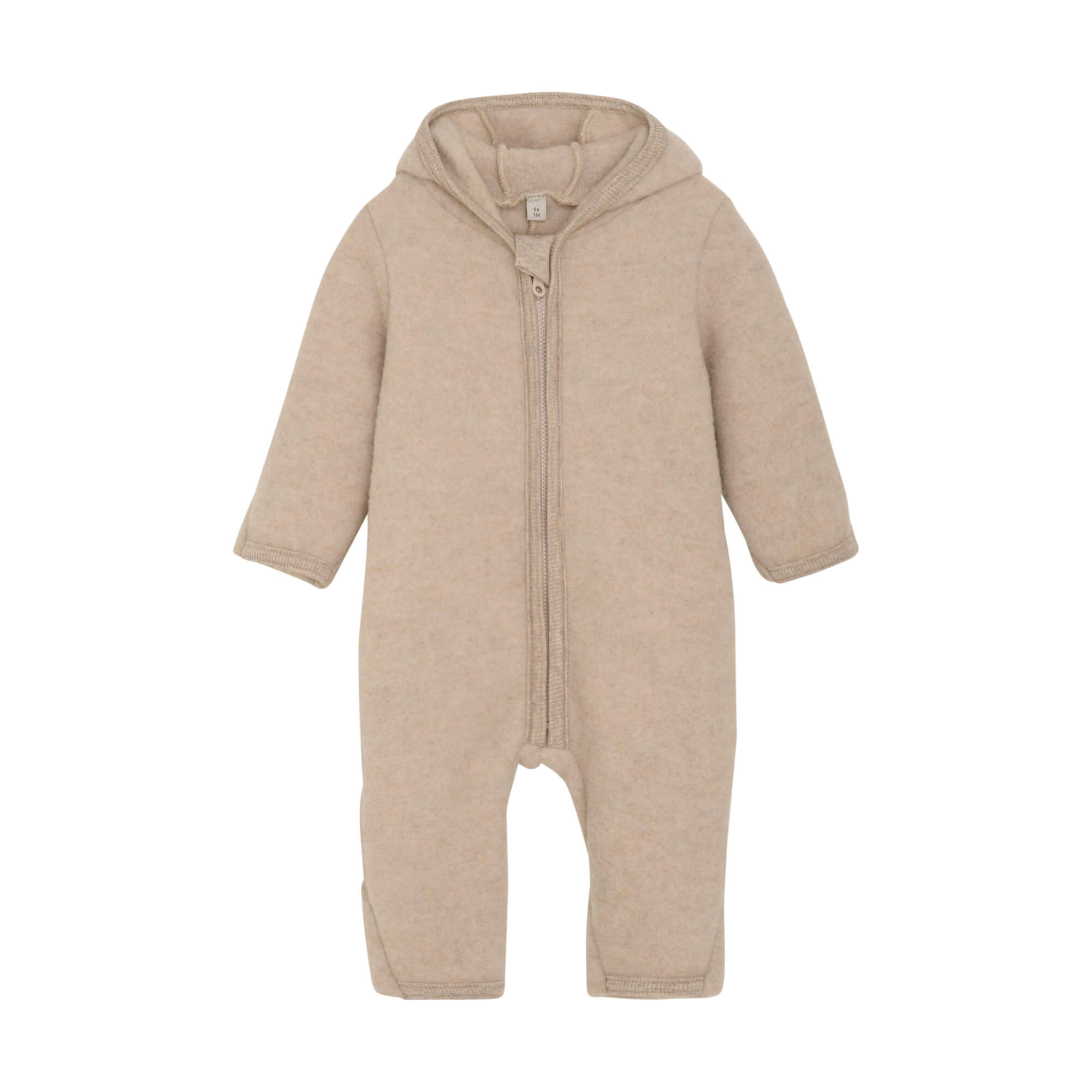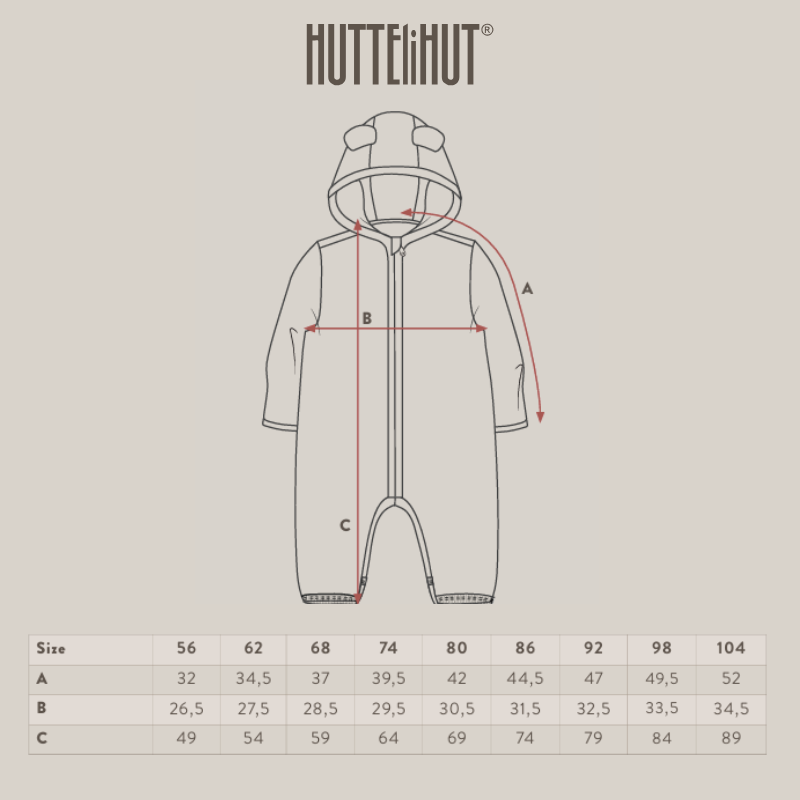 Kombinezon Huttelihut ma przyszyty kaptur o zaokrąglonym kształcie, z uroczymi małymi uszkami na górze. Kombinezon posiada długie rękawy i nogawki z praktycznymi wywijanymi mankietami (od rozmiaru 56 do 80), które pomagają utrzymać ciepło w małych rączkach i stópkach. We wszystkich otworach znajdują się prążkowane ściągacze. Kombinezon zapinany jest z przodu na ukryty zamek błyskawiczny z osłoną podbródka.