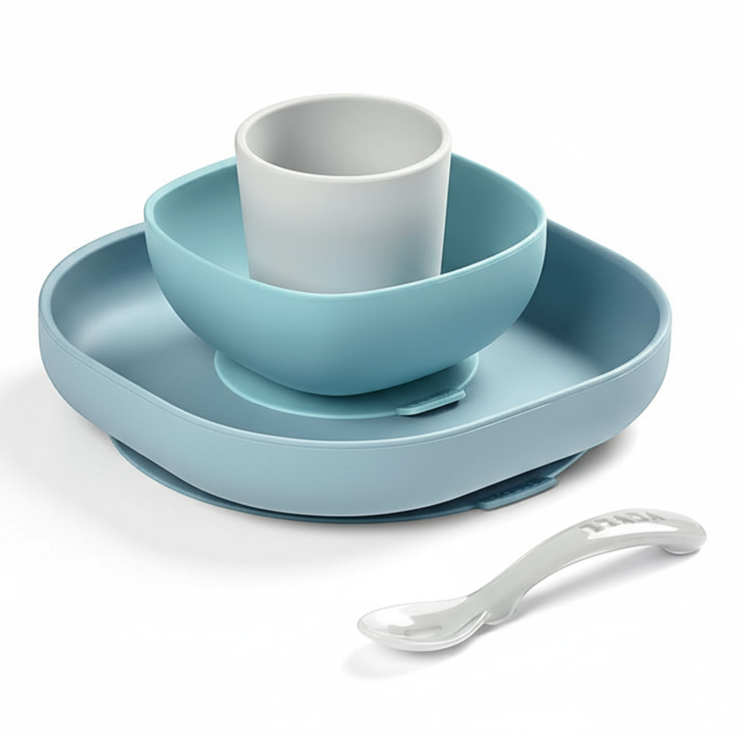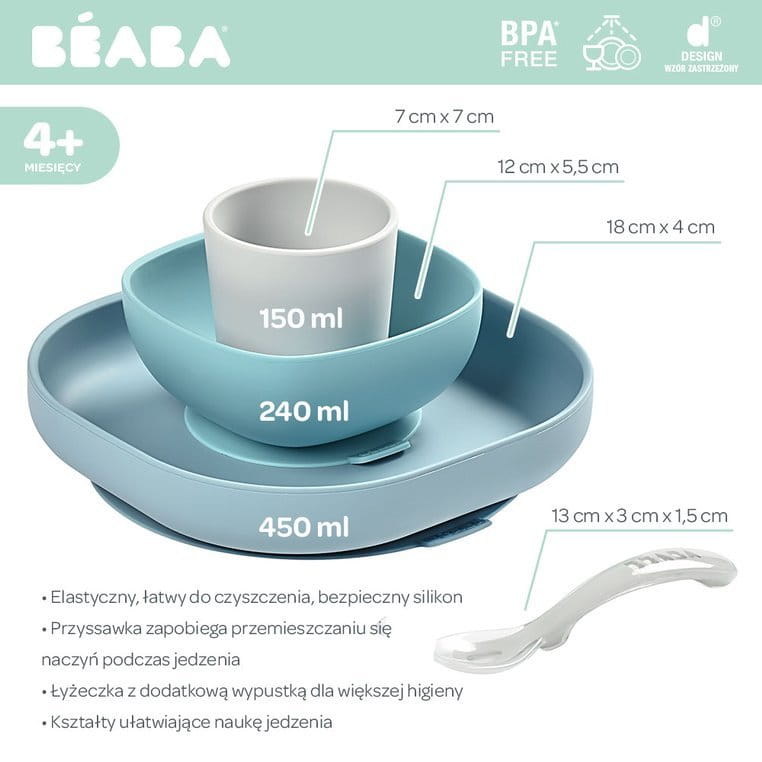 Składa się on z talerzyka, miseczki, kubka i łyżeczki treningowej. Wszystkie elementy zestawu charakteryzuje ergonomiczny, zaokrąglony kształt i miękkie, gładkie brzegi. Wyższe boki miseczki i talerzyka ułatwiają dziecku samodzielne nabieranie posiłku na widelec czy łyżkę. Naczynia te mają na spodzie antypoślizgową przyssawkę, dzięki czemu są stabilne i dobrze trzymają się stołu. Kubeczek jest poręczny i wygodny do nauki picia, a łyżeczka idealnie dopasowuje się do dziecięcej buzi i można ją odłożyć tak, by główka nie dotykała powierzchni, dzięki czemu jej używanie jest o wiele bardziej higieniczne.