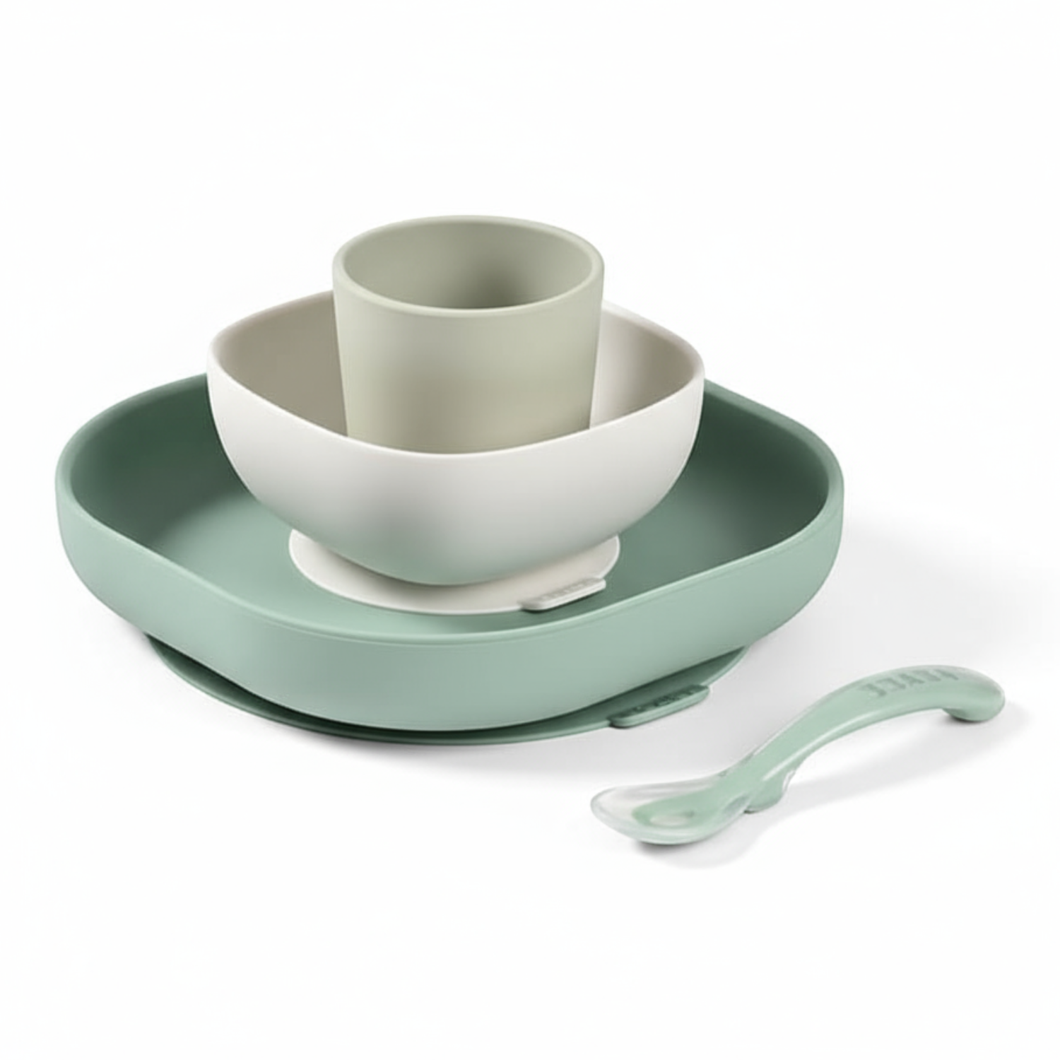 Składa się z talerzyka, miseczki, kubka i łyżeczki treningowej. Wszystkie elementy zestawu charakteryzuje ergonomiczny, zaokrąglony kształt i miękkie, gładkie brzegi. Wyższe boki miseczki i talerzyka ułatwiają dziecku samodzielne nabieranie posiłku na widelec czy łyżkę. Naczynia te mają na spodzie antypoślizgową przyssawkę, dzięki czemu są stabilne i dobrze trzymają się stołu. Kubeczek jest poręczny i wygodny do nauki picia, a łyżeczka idealnie dopasowuje się do dziecięcej buzi i można ją odłożyć tak, by główka nie dotykała powierzchni, dzięki czemu jej używanie jest o wiele bardziej higieniczne.