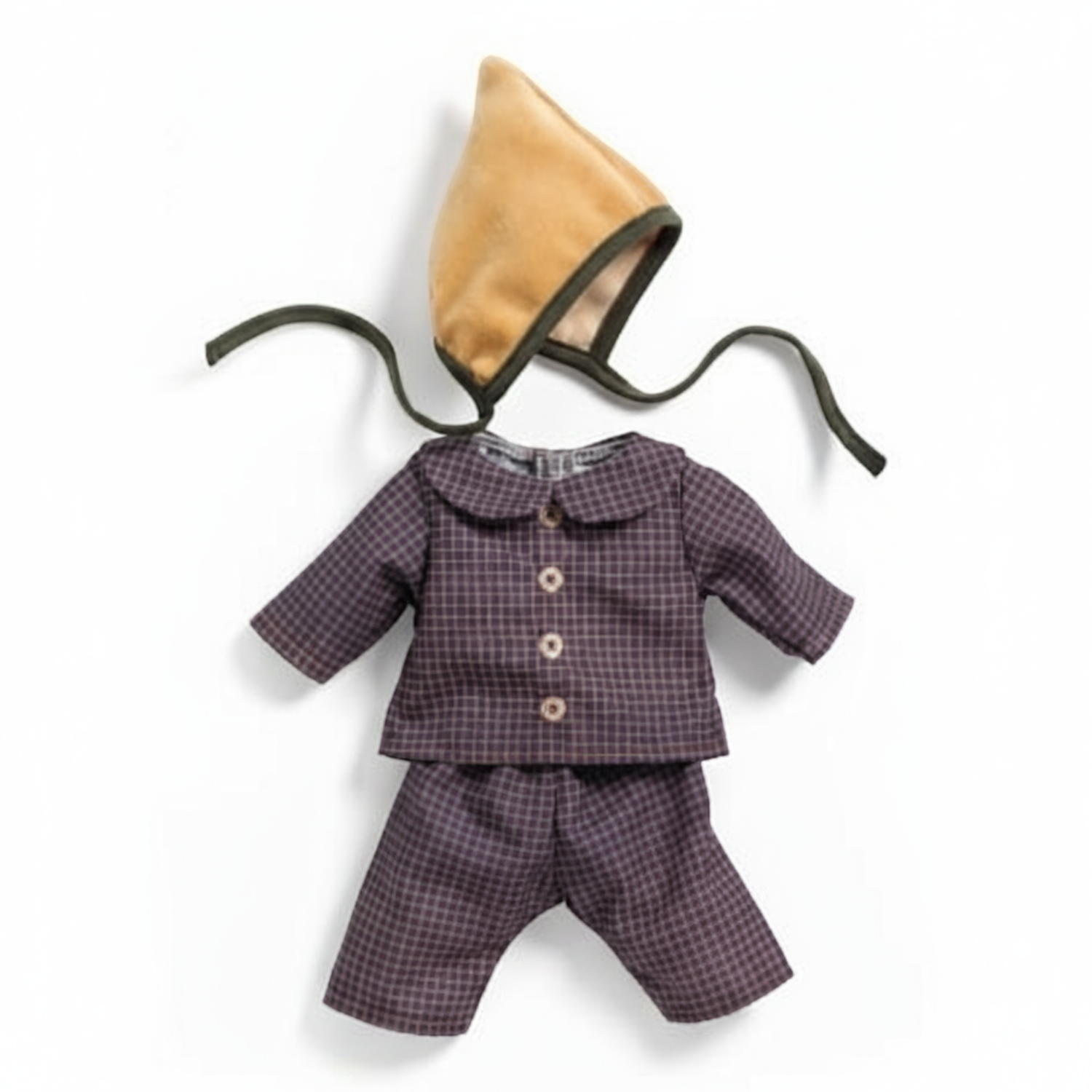 Wykonany ze 100% naturalnej bawełny, pasujący na lalki o wysokości od 28-34 cm. Spodenki posiadają elastyczną gumkę w pasie, a bluzeczka z kołnierzykiem jest zapinana na rzepy. Urocza czapeczka dodaje końcowego szyku stylizacji. Wdzięczny wzór w kratkę zachwyci każdą posiadaczkę lalki. Ubranko jest uszyte w taki sposób, aby było łatwo je założyć. Można prać w pralce w 30 °C.