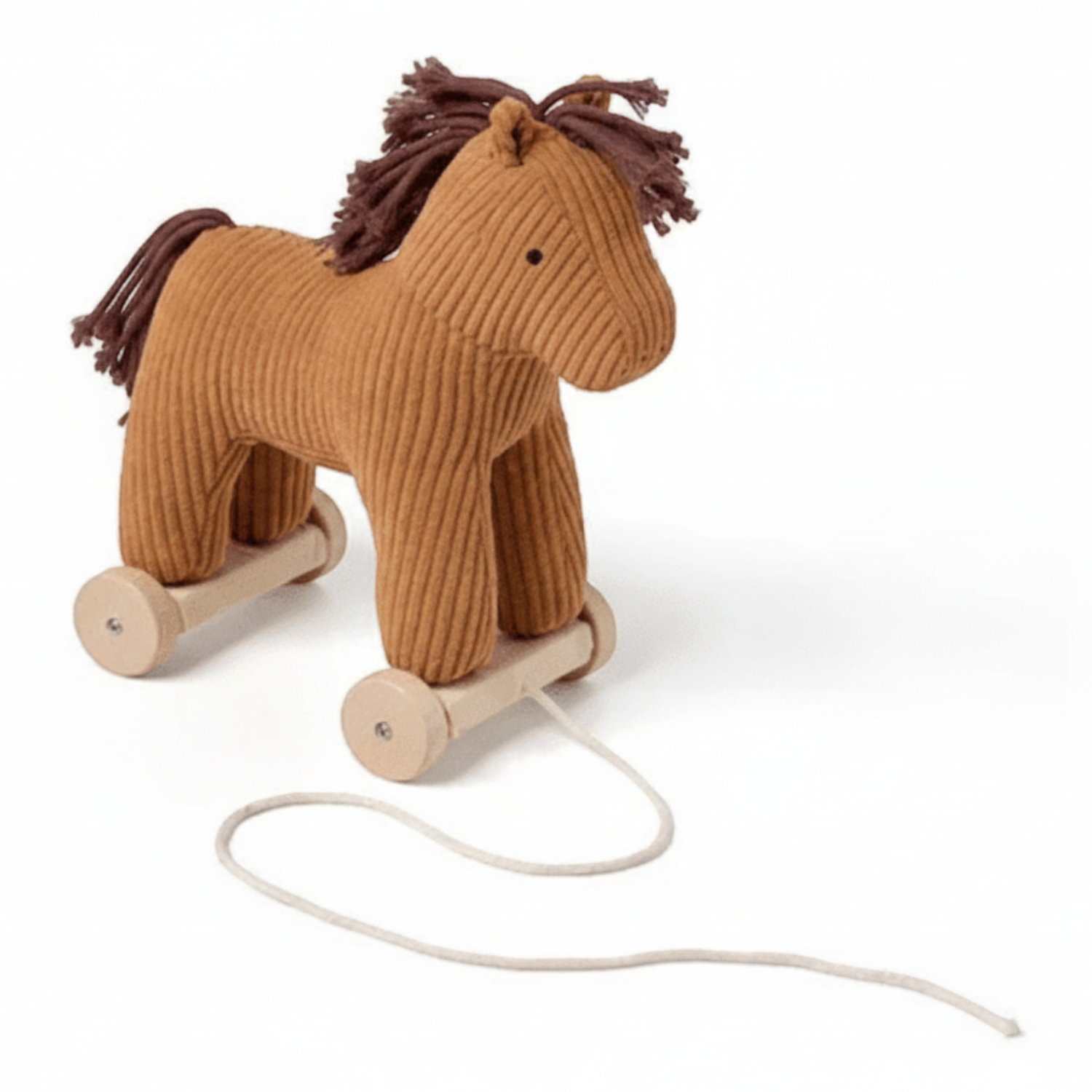 Uroczy konik do ciągnięcia wykonany z wytrzymałego płótna bawełnianego. Miękka, bawełniana grzywa i ogon zachęcają do przytulania, a sznurek umożliwia łatwe prowadzenie podczas spacerów, wspierając rozwój równowagi i koordynacji ruchowej. Po zdjęciu kółek staje się miękką przytulanką – idealną do spokojnej zabawy lub odgrywania ról. Dzięki delikatnemu wyrazowi pyszczka i miękkiej fakturze to wierny towarzysz codziennych przygód.