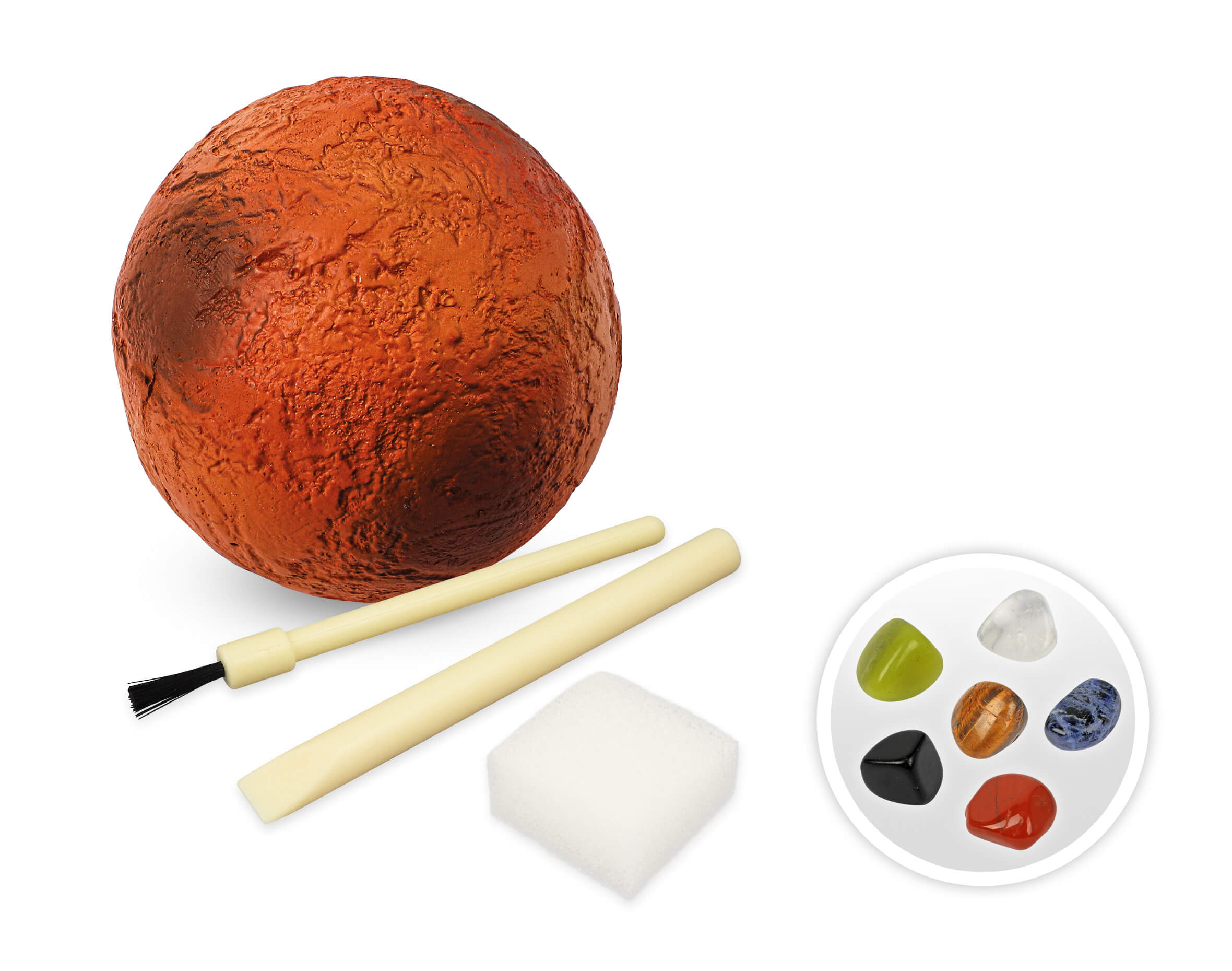 | Liczba elementów: | gipsowa planeta Mars, 6 kamieni (obsydian, kryształ górski, nefryt, tygrysie oko, sodalit, jaspis czerwony), dłuto, pędzelek, gąbeczka, instrukcja |