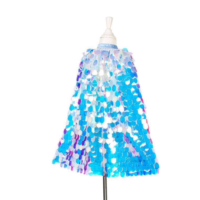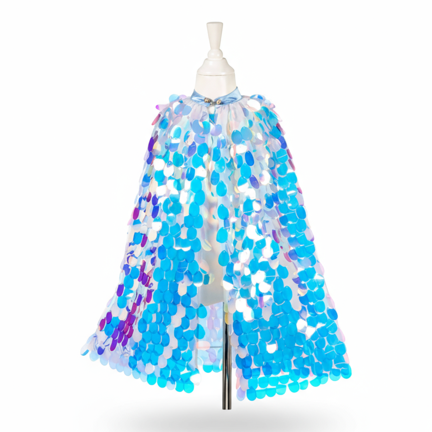 Peleryna zachwyca dbałością o detale. Jest efektowna, uszyta ze zwiewnego tiulu i obszyta dużymi, holograficznymi cekinami w kolorze niebieskim i fioletowym (imitują syrenie łuski). Zapinana pod szyją na guziczki z pętelką – perełki. Komfortowa do noszenia. Idealna jako dodatek do stroju syrenki lub samodzielny kostium na bal przebierańców czy Sylwestra. Sprawdzi się także jako prezent.
