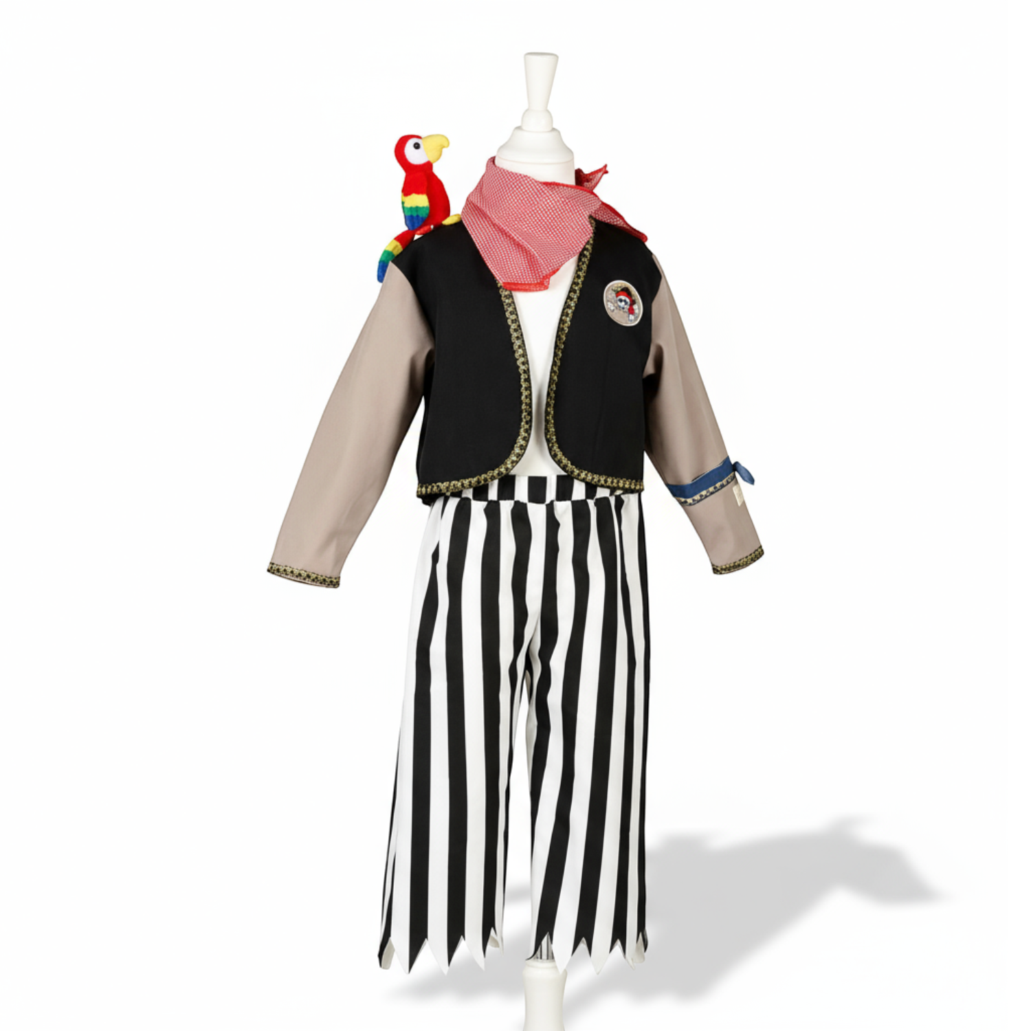 Składa się z długich spodni w biało-czarne paski ze strzępionymi nogawkami i gumką w pasie oraz granatowo-szarej kurtki ze złotymi detalami i papugą na prawym ramieniu. W komplecie jest także czerwona bandana do zawiązania na szyi lub głowie. Zestaw jest miękki, łatwy do samodzielnego zakładania i komfortowy do noszenia. To idealny strój na bal przebierańców, przedstawienie czy Sylwestra. Sprawdzi się także jako prezent.