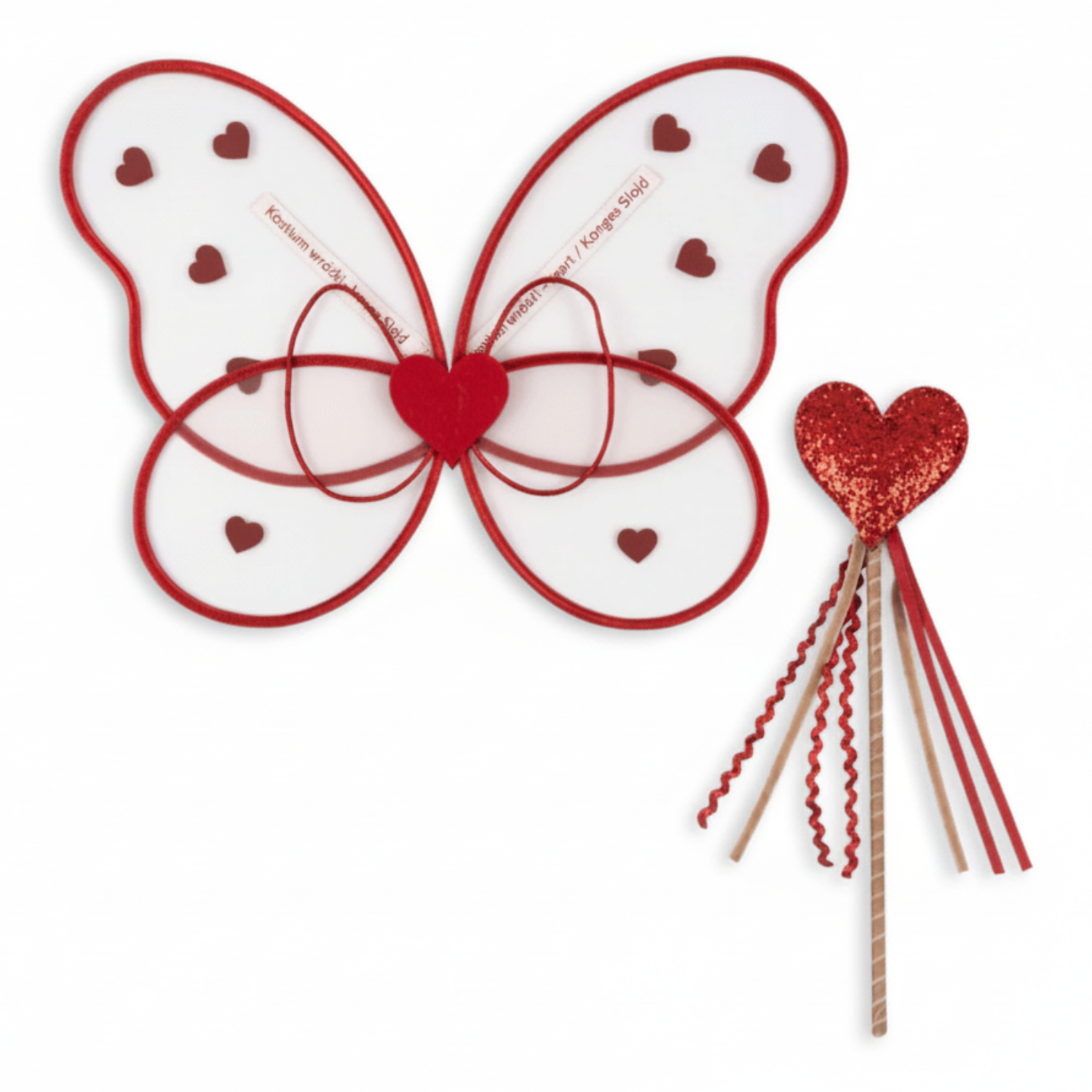 Zestaw idealny dla małych marzycielek chcących wcielić się w rolę wróżki miłości lub magicznej księżniczki. Zestaw zawiera duże, półprzezroczyste skrzydła w kształcie motyla oraz różdżkę ozdobnymi wstążkami w różnych odcieniach czerwieni i w różnych fakturach.