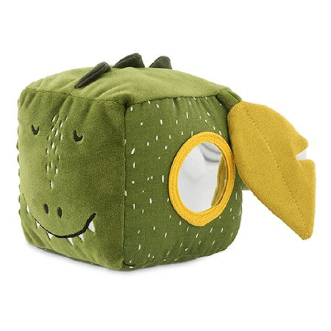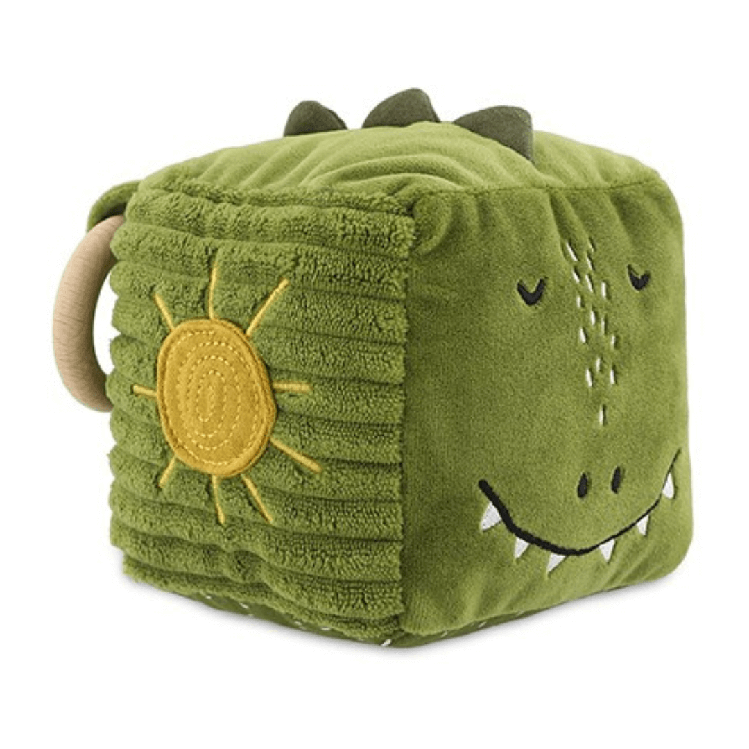 Kostka oferuje różne tekstury, łapki i ogon, lusterko, szeleszczące wnętrze oraz drewniany i silikonowy pierścień – idealne do gryzienia i noszenia.